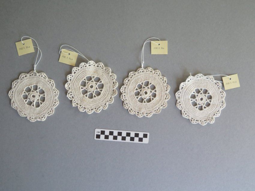 Off white crocheted doily, from set of 4 total (a-d). The doily measures 4.25" (diam).