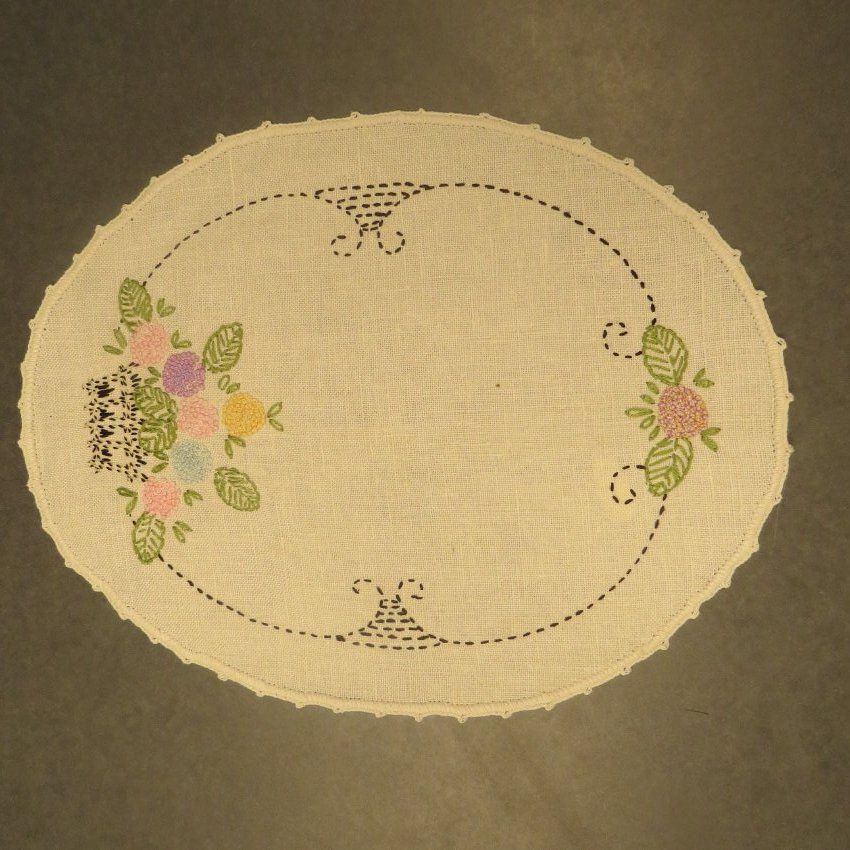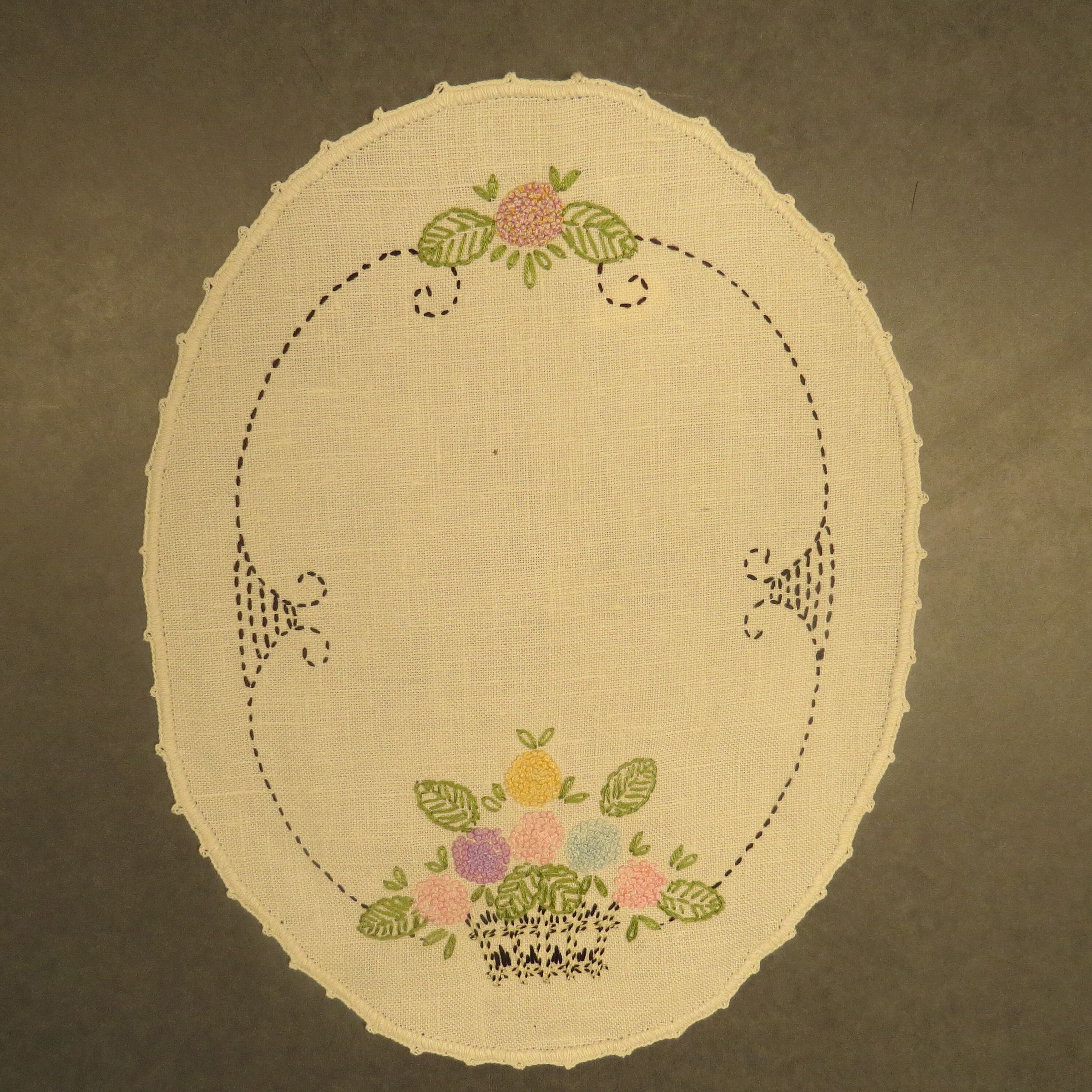 This is an oval dresser scarf that has been embroidered with a floral basket design. The dresser scarf is one of a set of 2. The scarf measures 8" (w) x 10.5" (l).