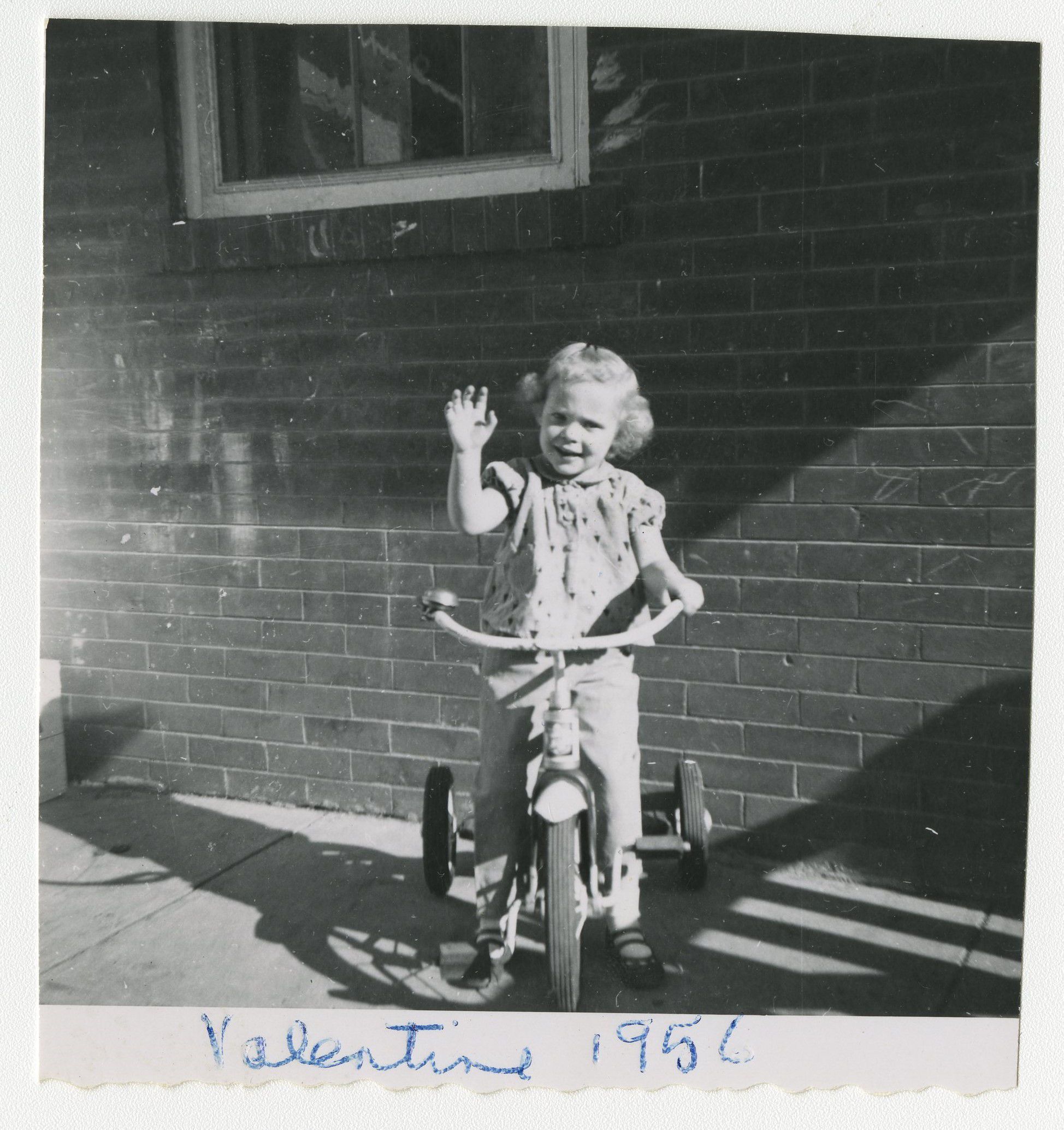 Black and white photograph of a girl in the Brunner family. Handwritten in blue is Valentine 1956.
