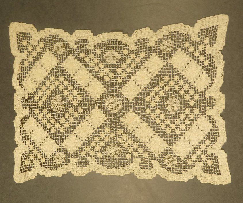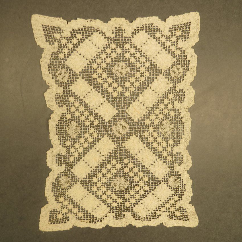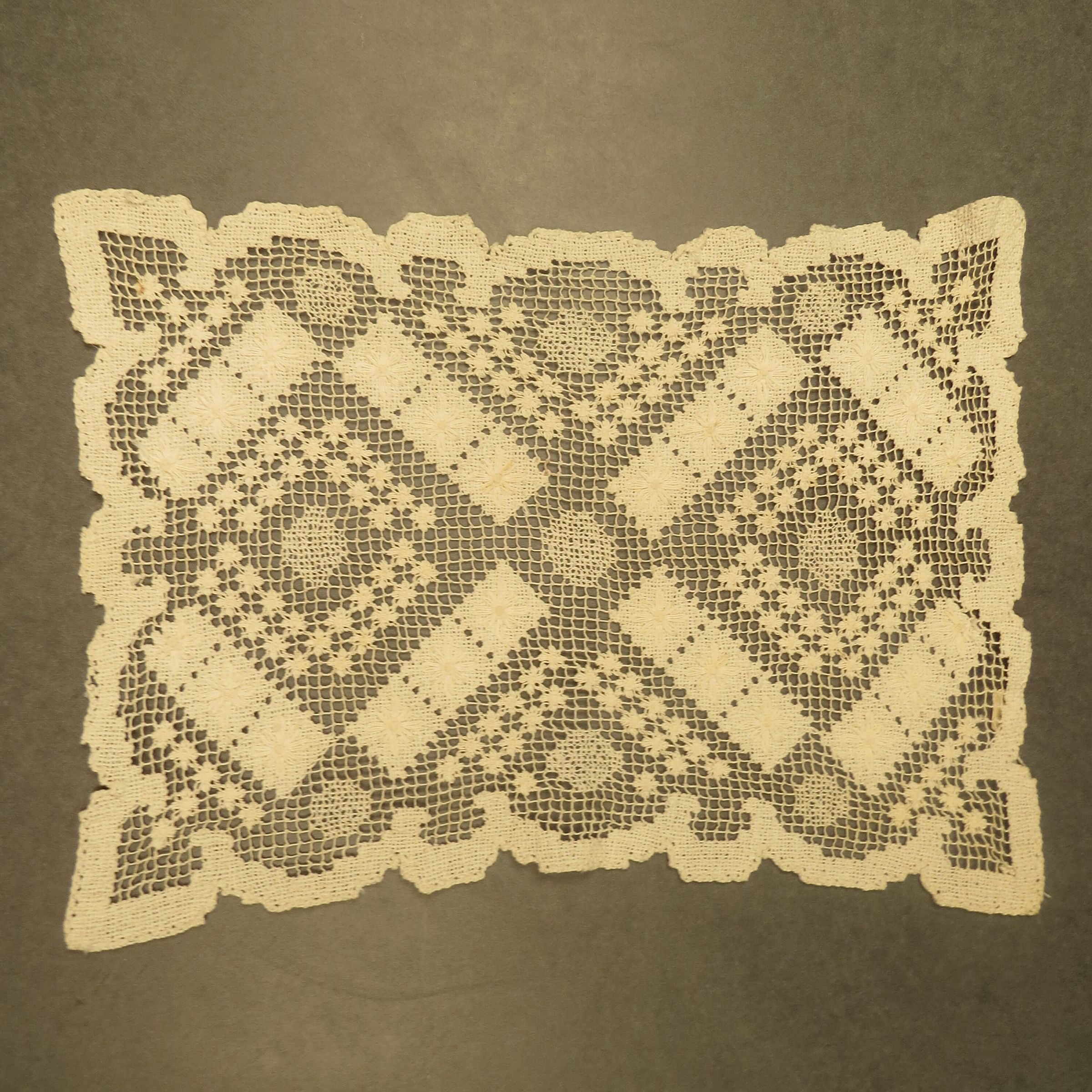 Part of a set of three matching rectangular lace scarves for furniture. More of a geometric lace design than floral. Furniture scarf measures 9" (w) x 14" (l).