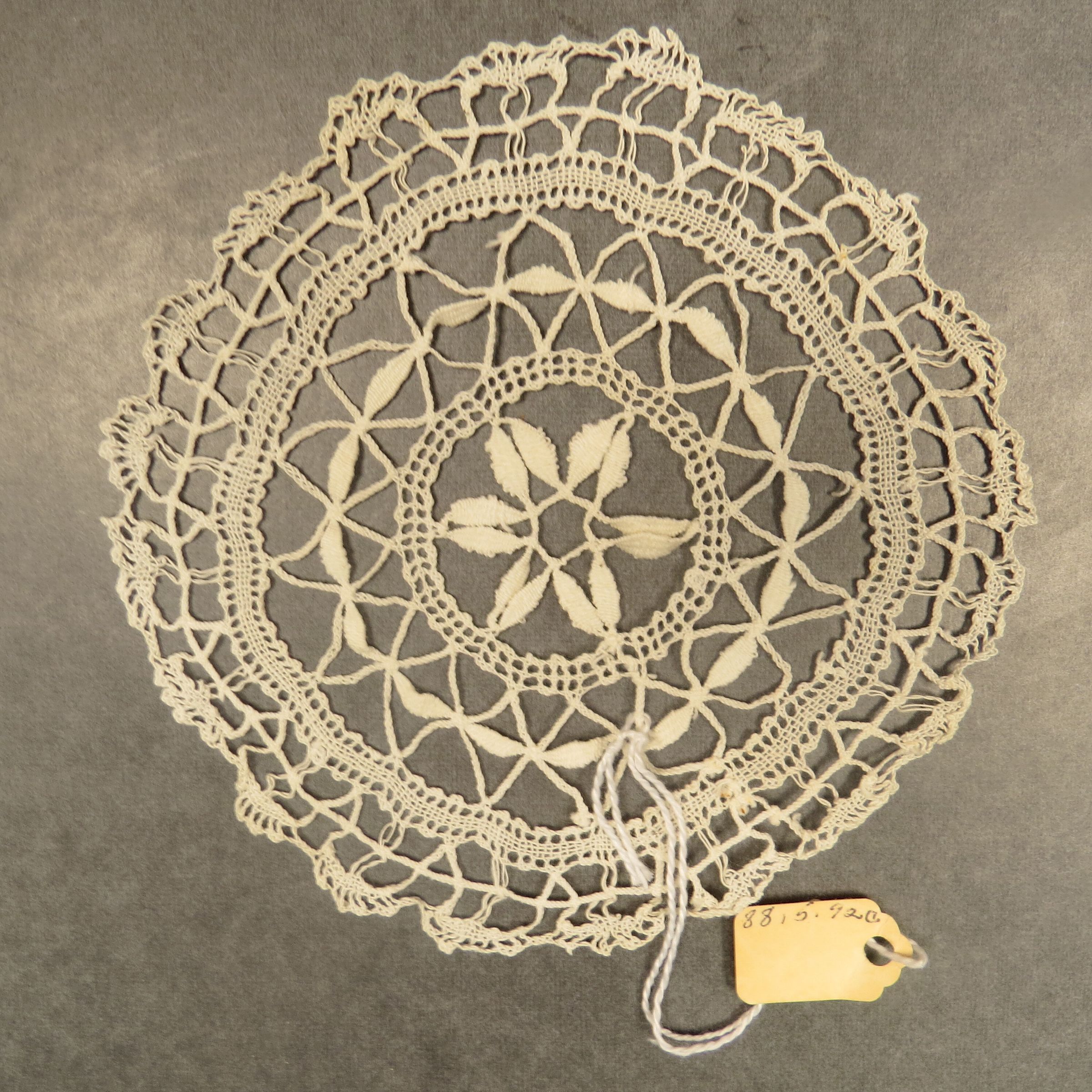 White doily, crocheted, round, from set of 10 total (a-j). Extremely fine crochet doily of thin thread. Possibly tatted. Very loose design often called openwork. Originally on the back of quilt hanging in waiting room. Doily measures 4.5" (diam).Collection