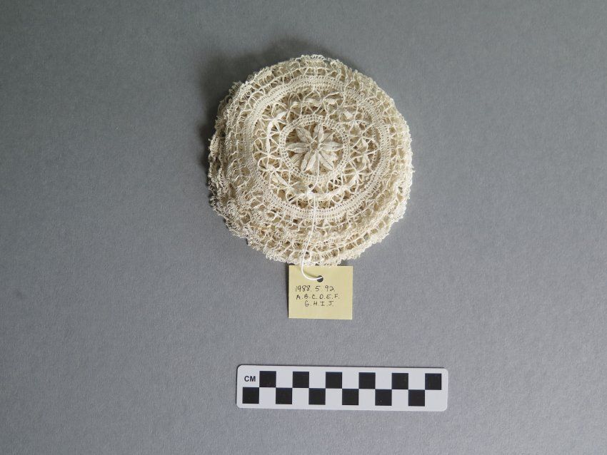 White doily, crocheted, round, from set of 10 total (a-j). Extremely fine crochet doily of thin thread. Possibly tatted. Very loose design often called openwork. Originally on the back of quilt hanging in waiting room. Doily measures 4.5" (diam).Collection