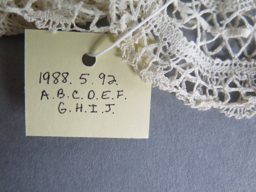 White doily, crocheted, round, from set of 10 total (a-j). Extremely fine crochet doily of thin thread. Possibly tatted. Very loose design often called openwork. Originally on the back of quilt hanging in waiting room. Doily measures 4.5" (diam).Collection