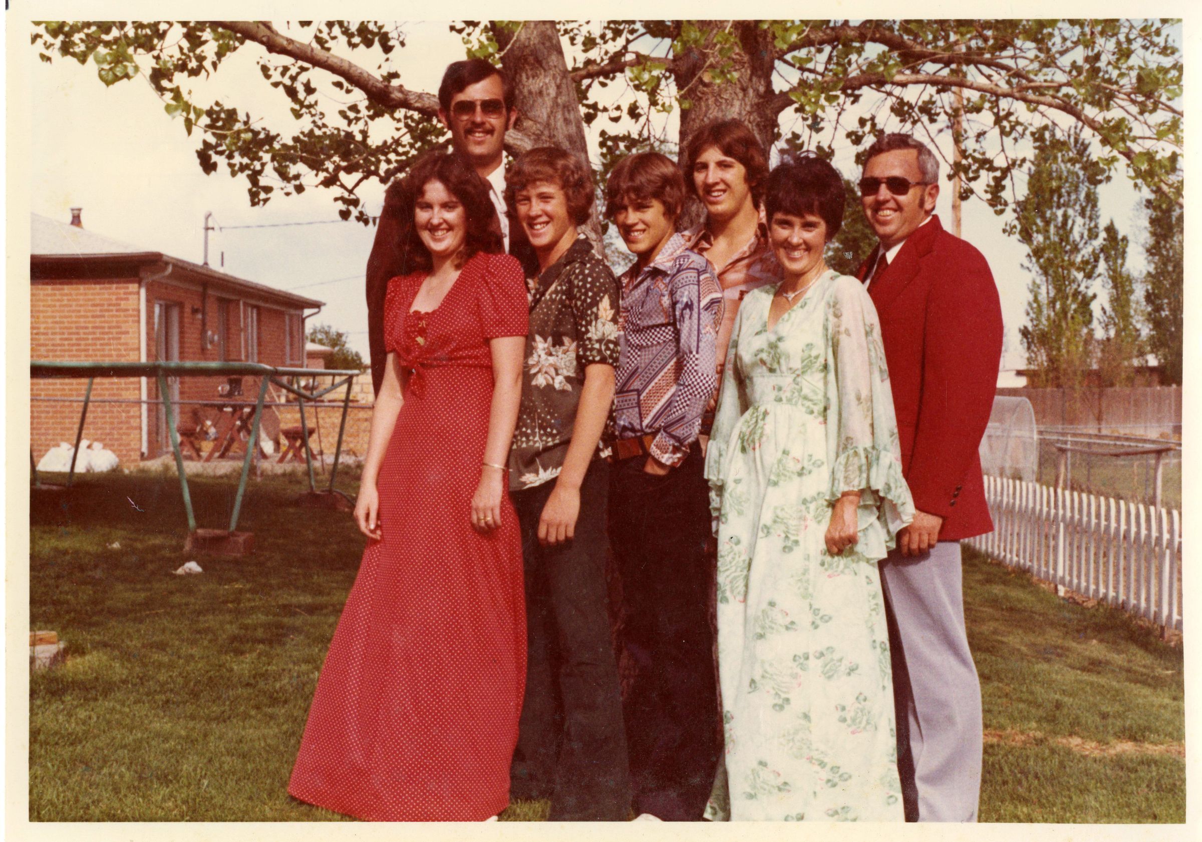 A color photograph of the Chestnut family outside of their home, taken on Mother's Day 1970. In front, from left-to-right: Kathy, Kelly, Rick, and June Chestnut. In the back, from left-to-right: Steven, Randy, and Tom Chestnut.Photograph Details