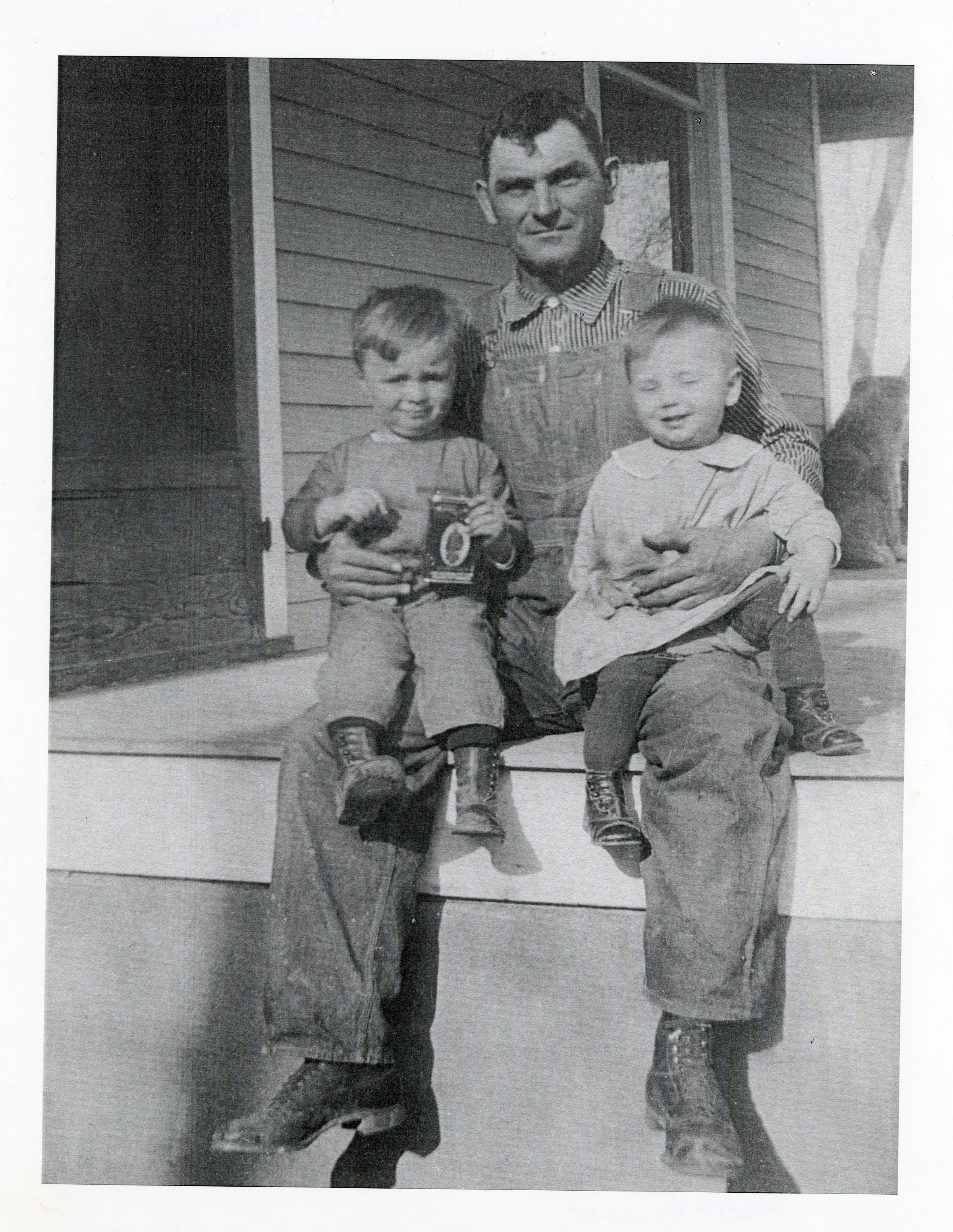 These are black and white photo of Albert Brunner with James Jr & John Albert Cline outside at a unidentified porch. One is holding a Prince Albert tobacco can and there's a dog in the background.