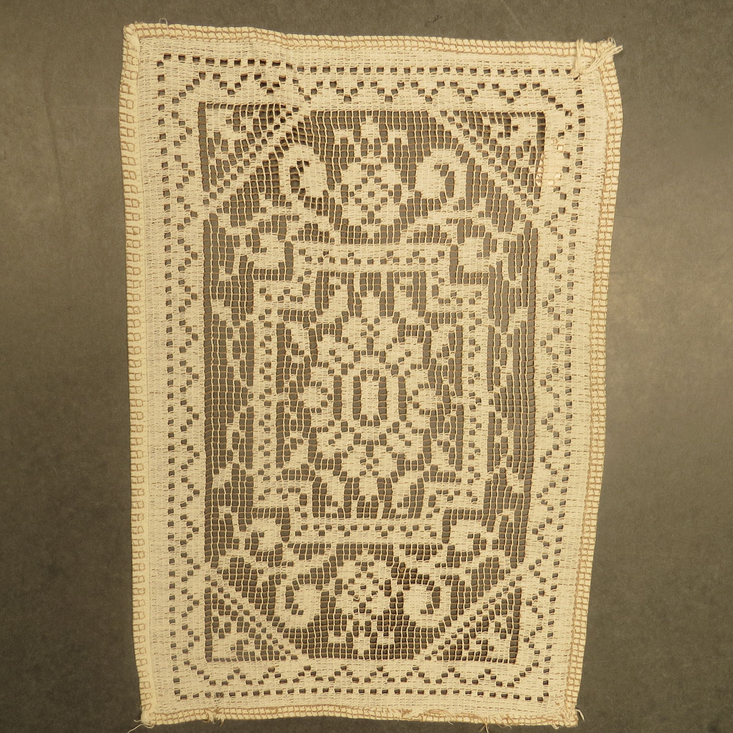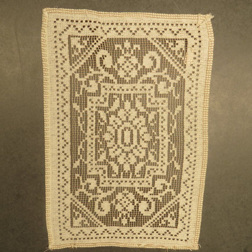 Set of three rectangular furniture protector. They are detailed and machine made. These are the shape and size that would have been used on the arm of a chair. Furniture scarf measures 8" (w) x 12.25" (l).