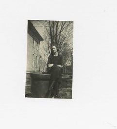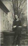 Black and white photograph of a young woman sitting outside. It is probably Lib Shaw.