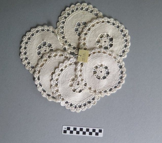 Set of 6 matching white cotton circular doilies with yarn web center, thicker main section and crocheted loosely again around the outside. The doily measures 6" (dia).