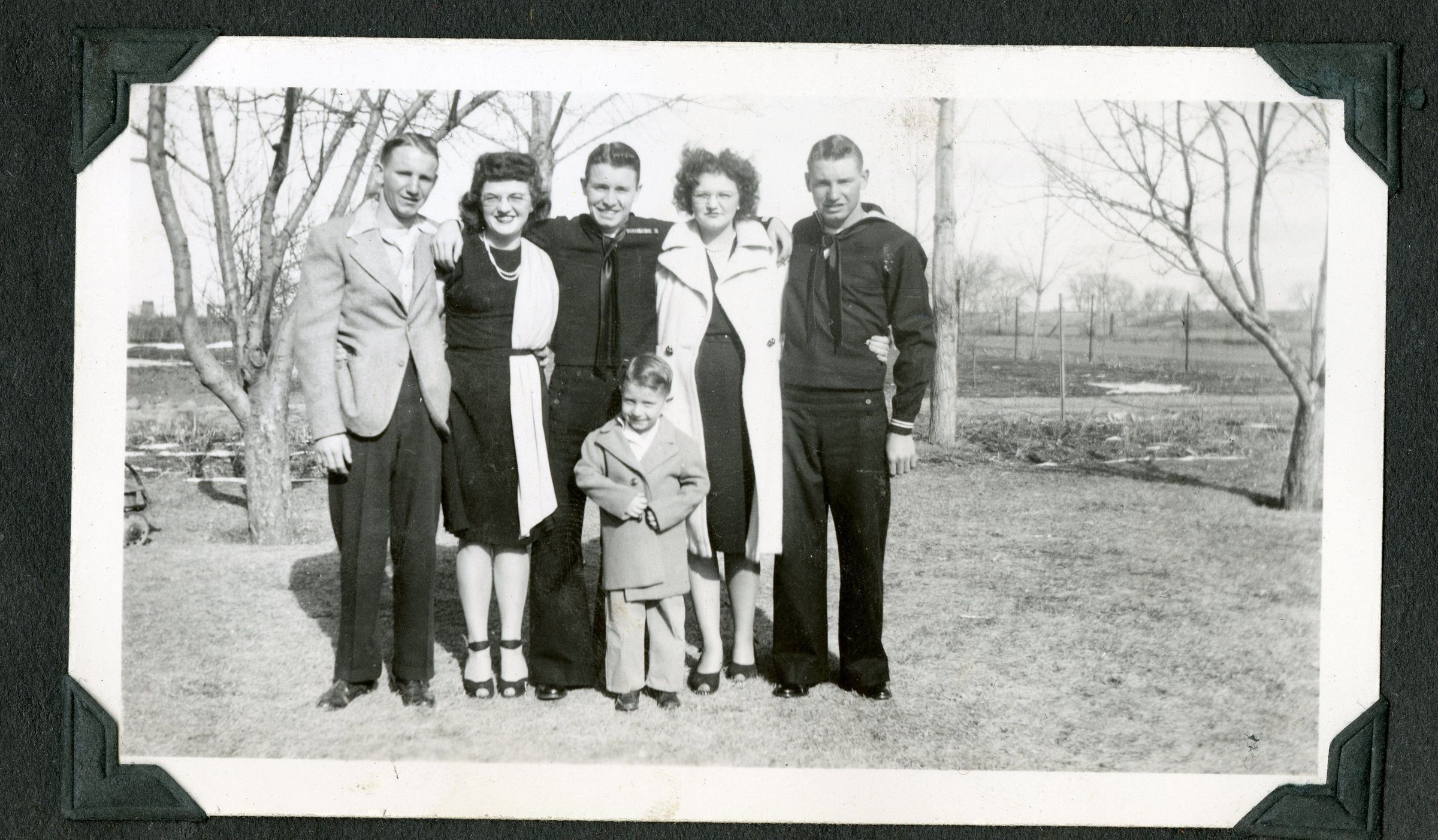 Black and white photograph of a group of six people. There are three young men, two women, and a boy. The boy is probably Lester K Brunner. Behind him are his three older brothers, Dale, Clyde, and Gib.