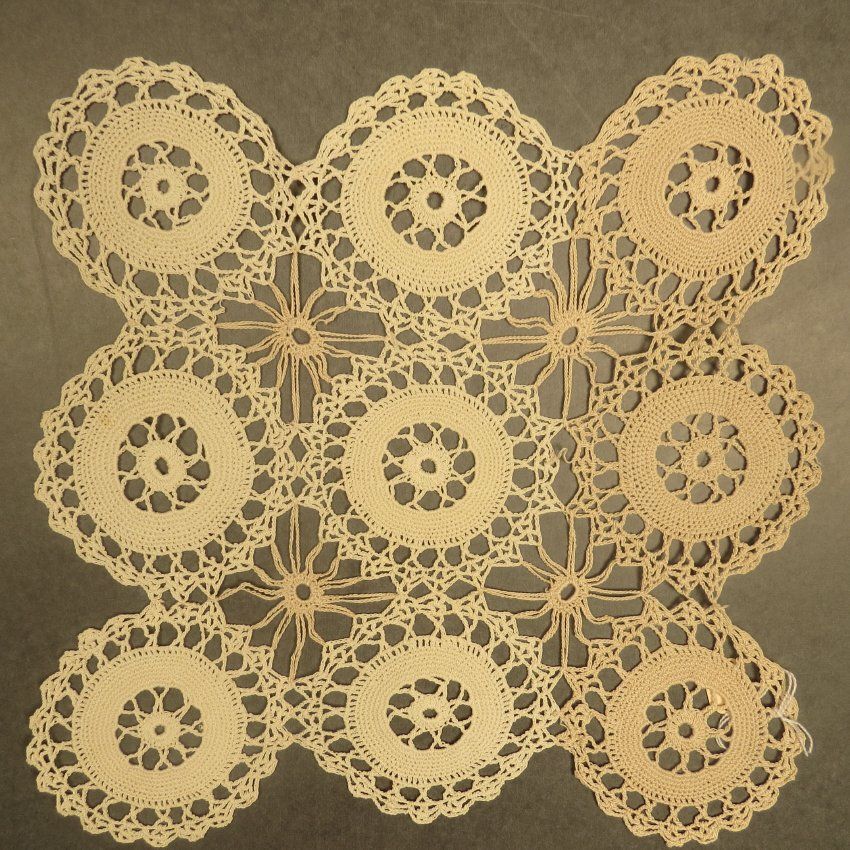 White crocheted dresser scarf. Consists of 9 circles tacked together. From 3 piece set (a-c), square and rectangle. Dresser scarf measures 11" (w) x 12" (l).