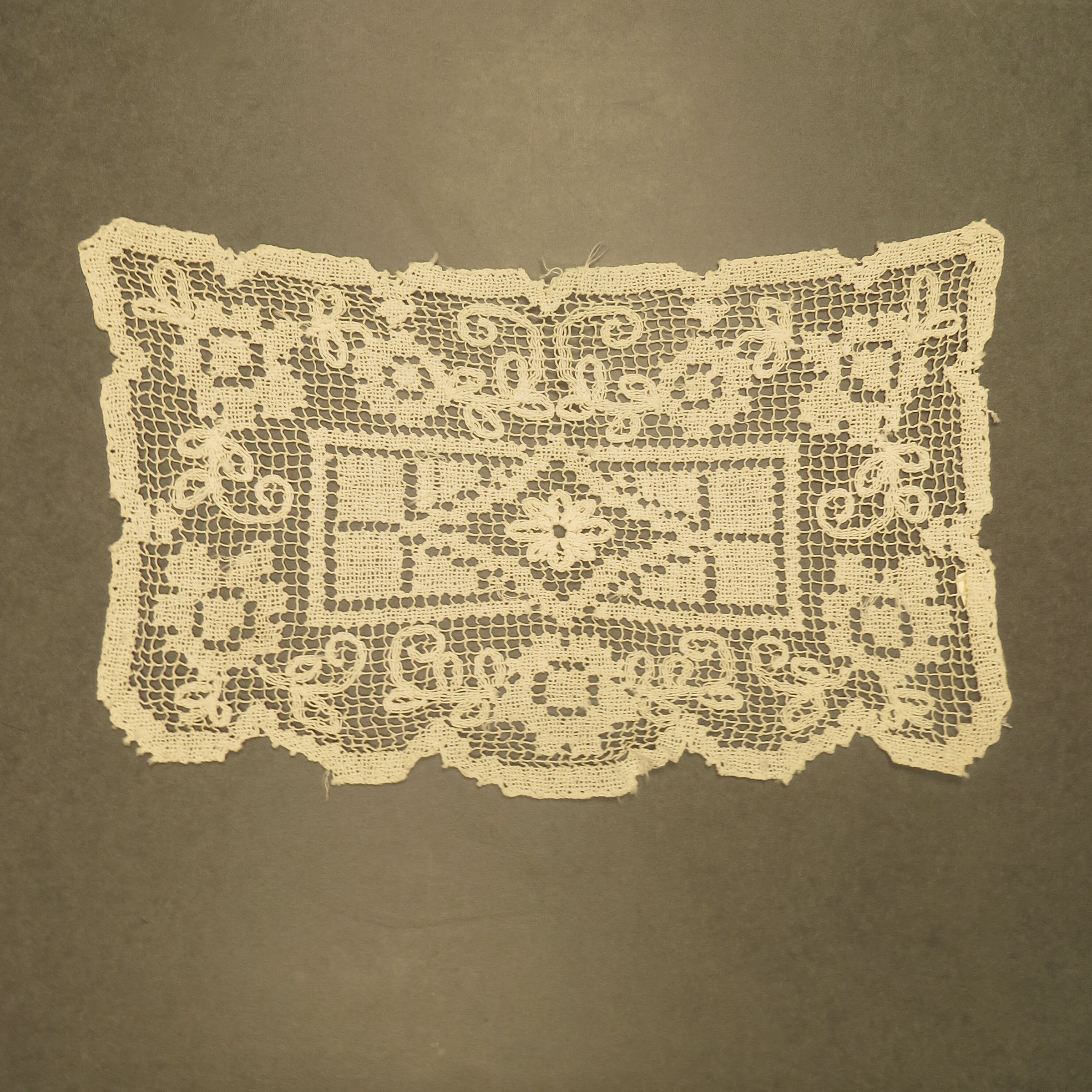 A set of three textiles used to protect a chair most likely. The larger piece is used for the back of the chair and the matching smaller pieces are for the arms of the chair. Rectangular dresser scarf. From 3 piece set (a-c). Furniture scarf 9" (w) x 14" (l).