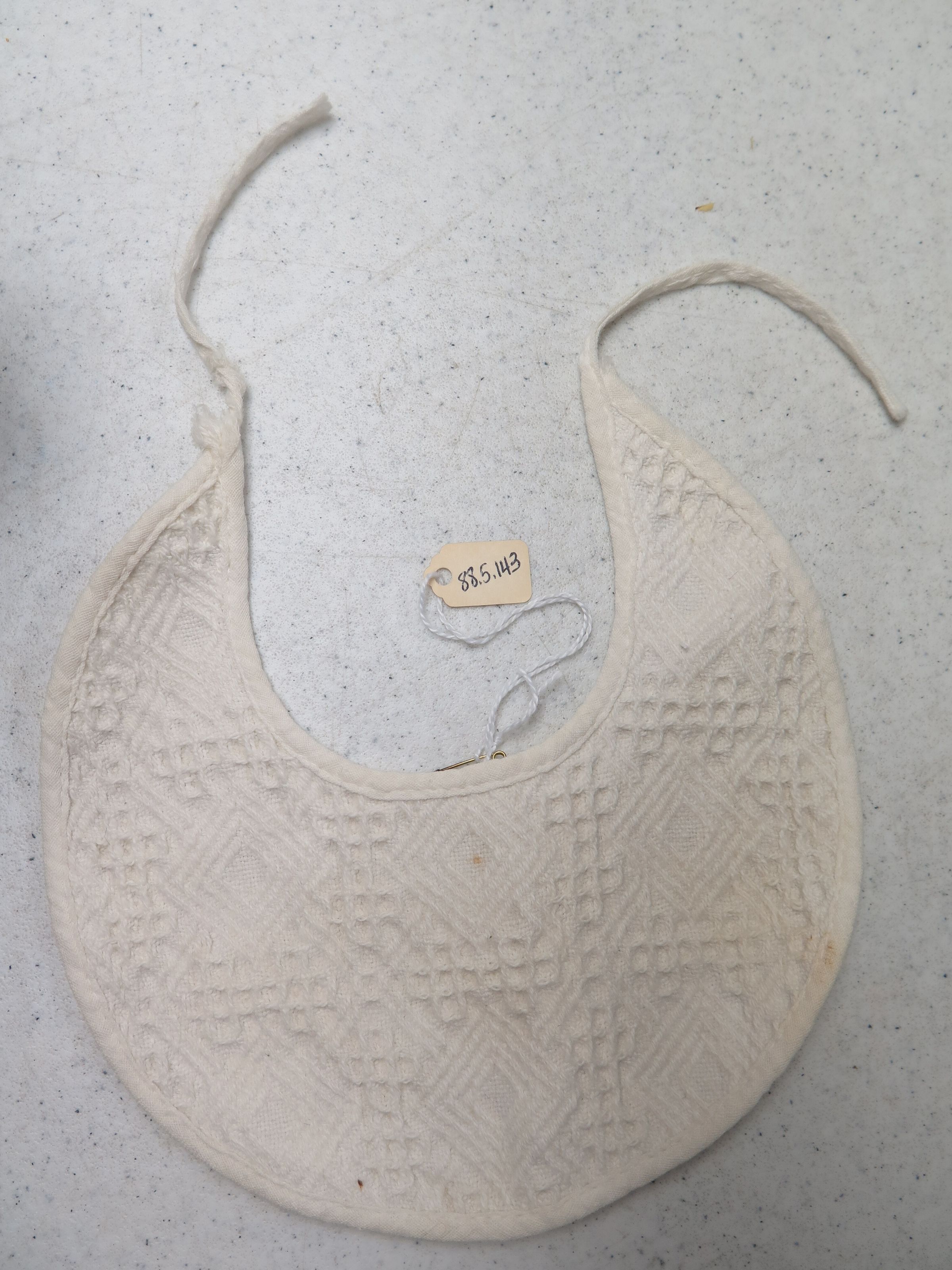 This is a white cotton baby bib. The bib has an embroidery pattern in the same white color as the backing. The bib was on a doll with the number 96. The bib measures 7" (h) x 6.5" (w).