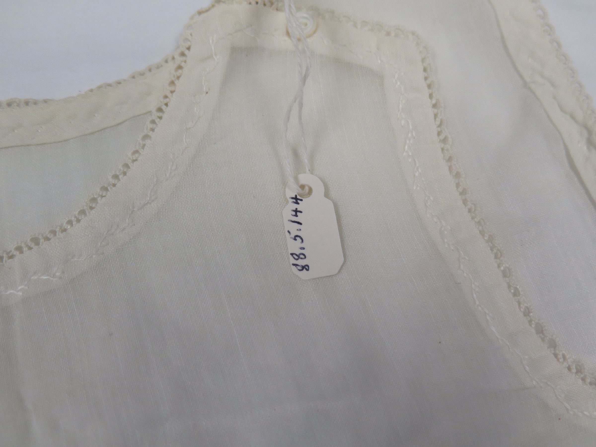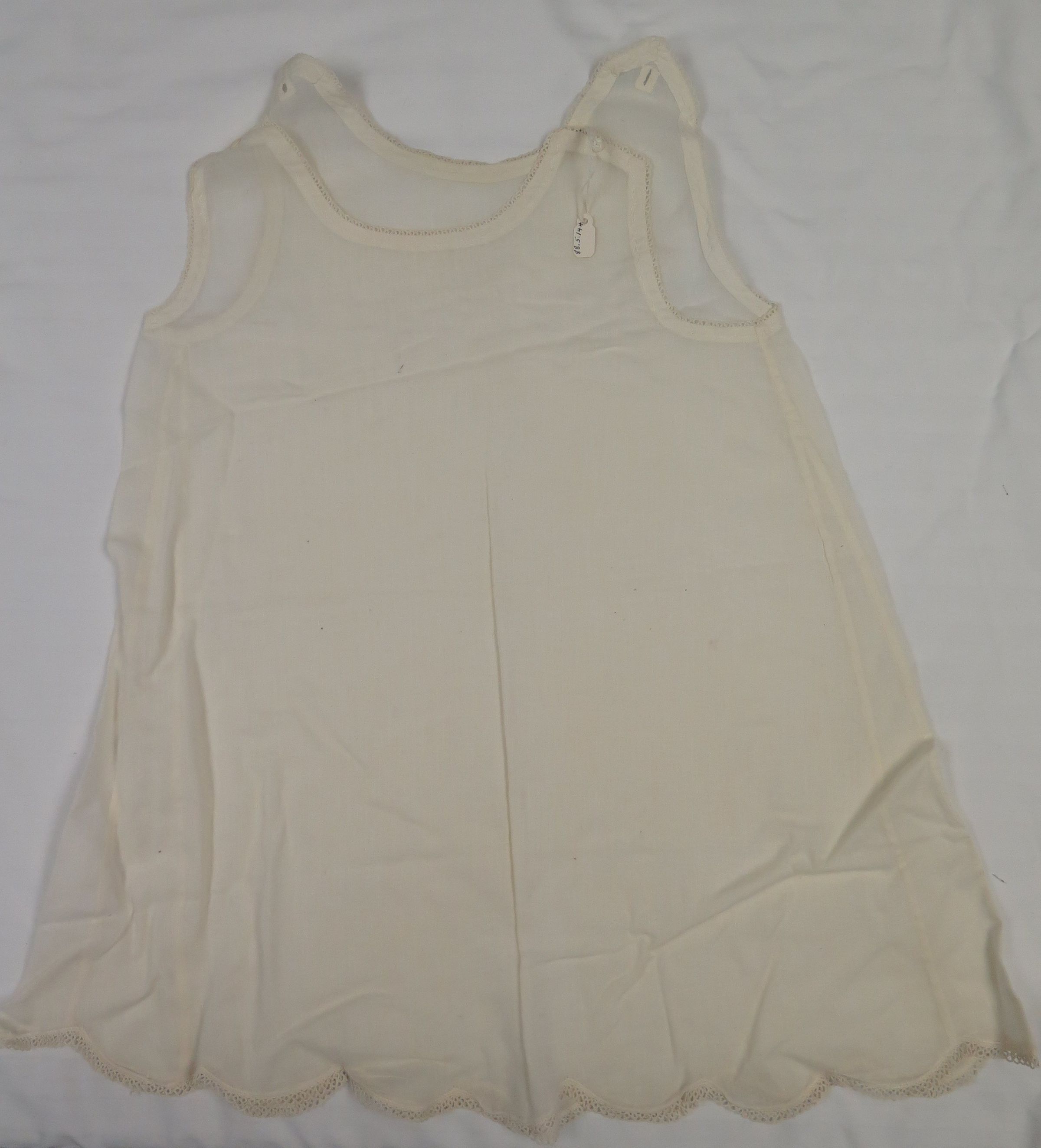 Child's white sleeveless night dress or slip. The edges of the sleeves, bottom and neckline are embroidered. The bottom of the dress has scalloped edges. Slip measures 9" (w) x 20" (l).Collection