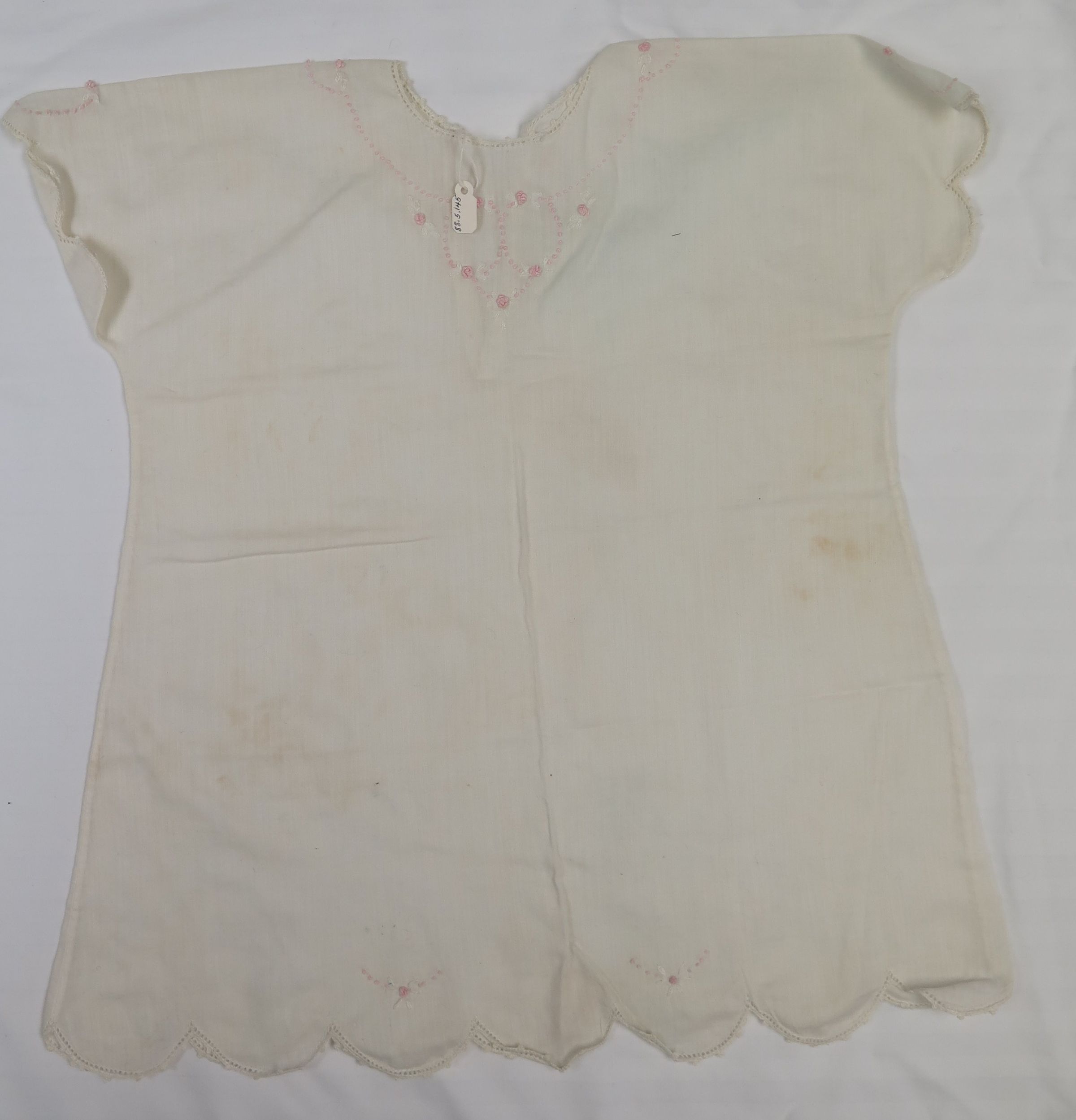 White dress with pink flowers embroidered around the neck, in the shape of a necklace, at the top of the sleeves and two at the bottom. The sleeves and bottom have scalloped edges. Dress measures 10" (w) x 17" (l).Collection