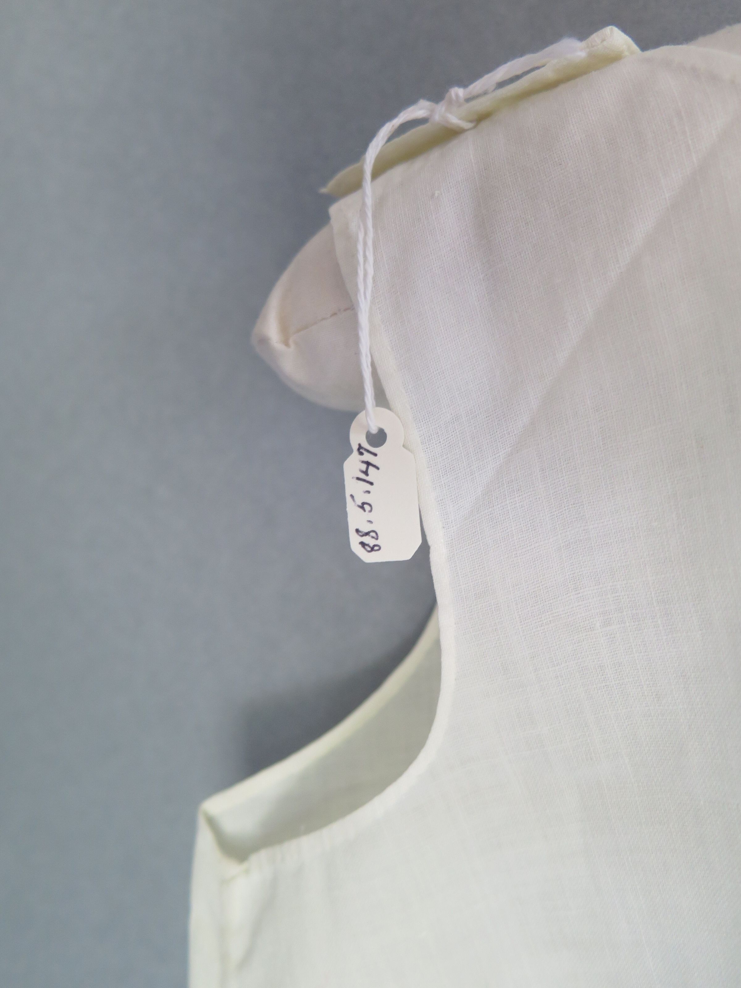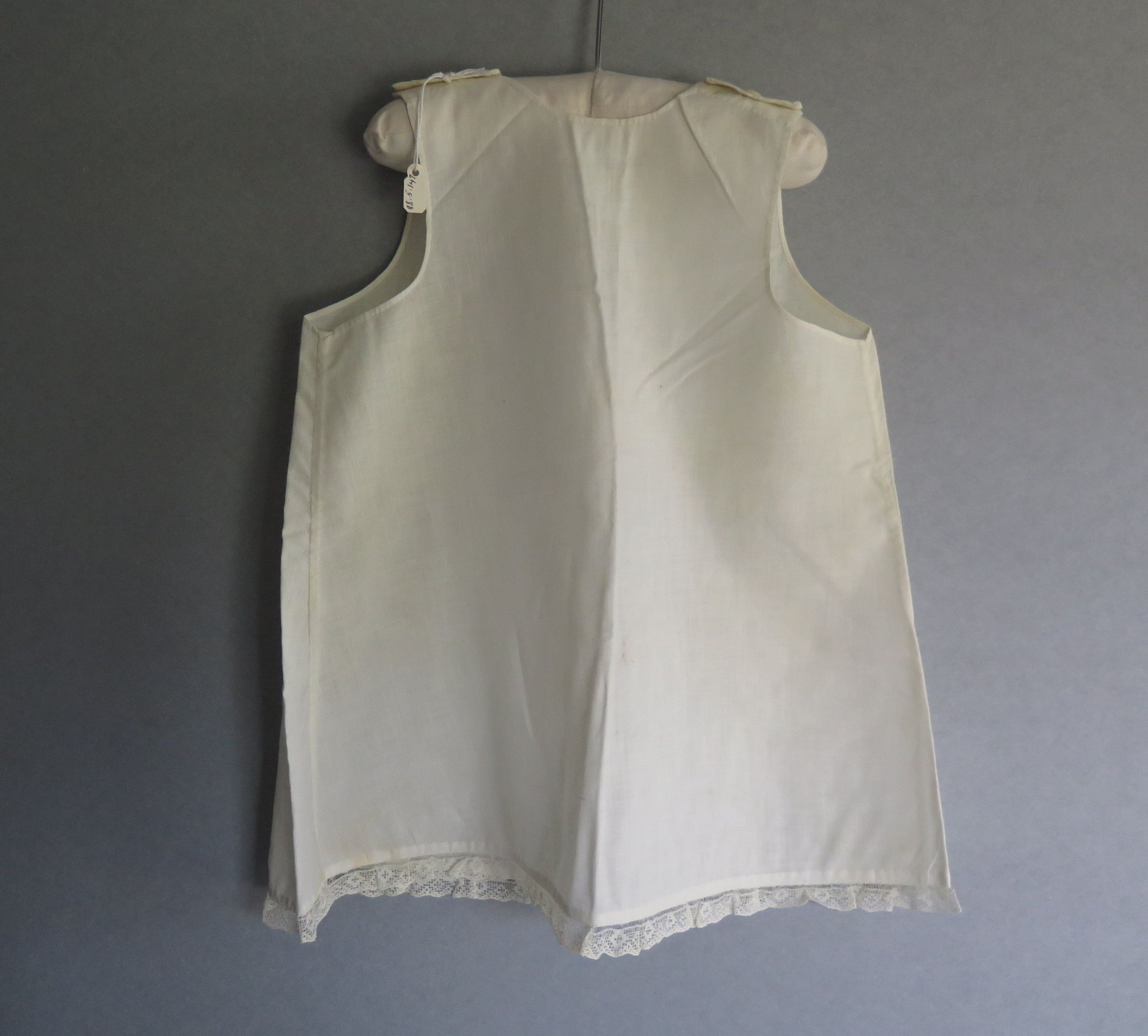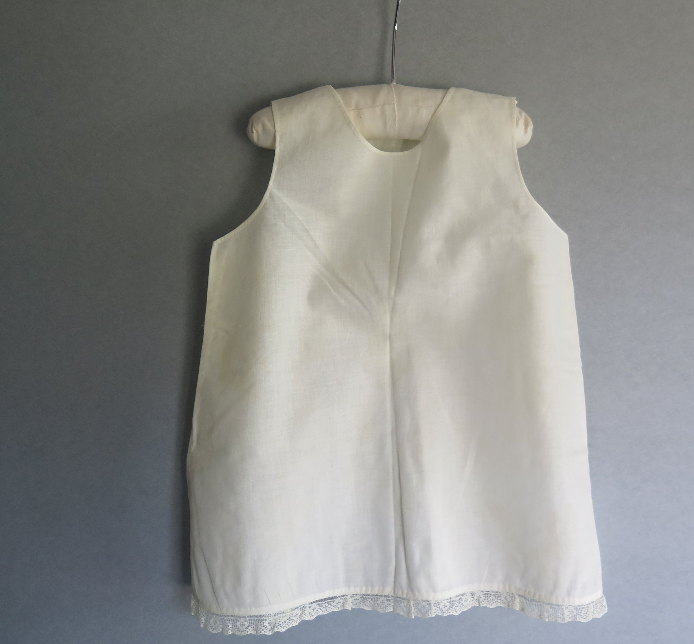 Baby's white slip with a lace hem. The two shoulders button and unbuttoned to close the slip. The slip measures 8" (w) x 15" (l).