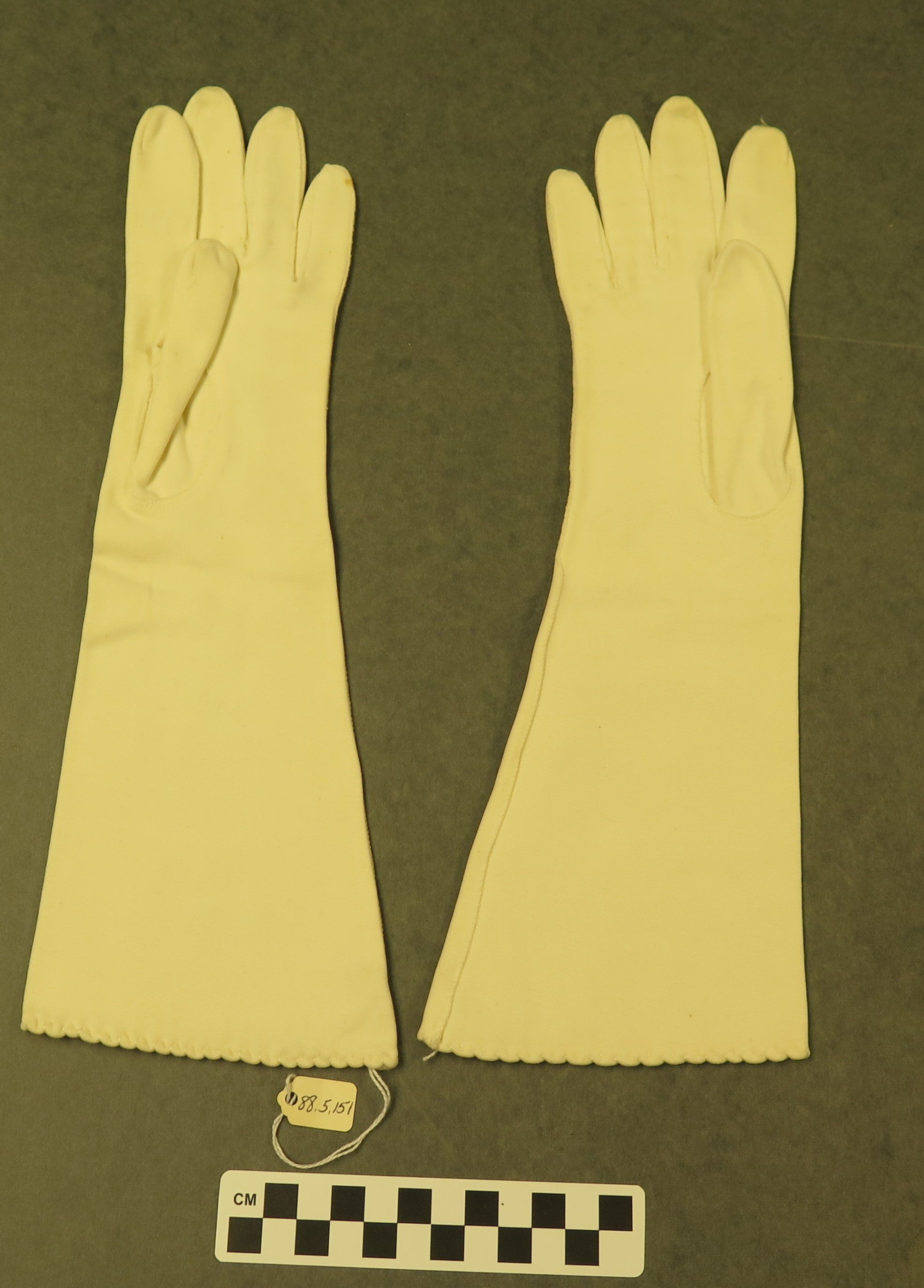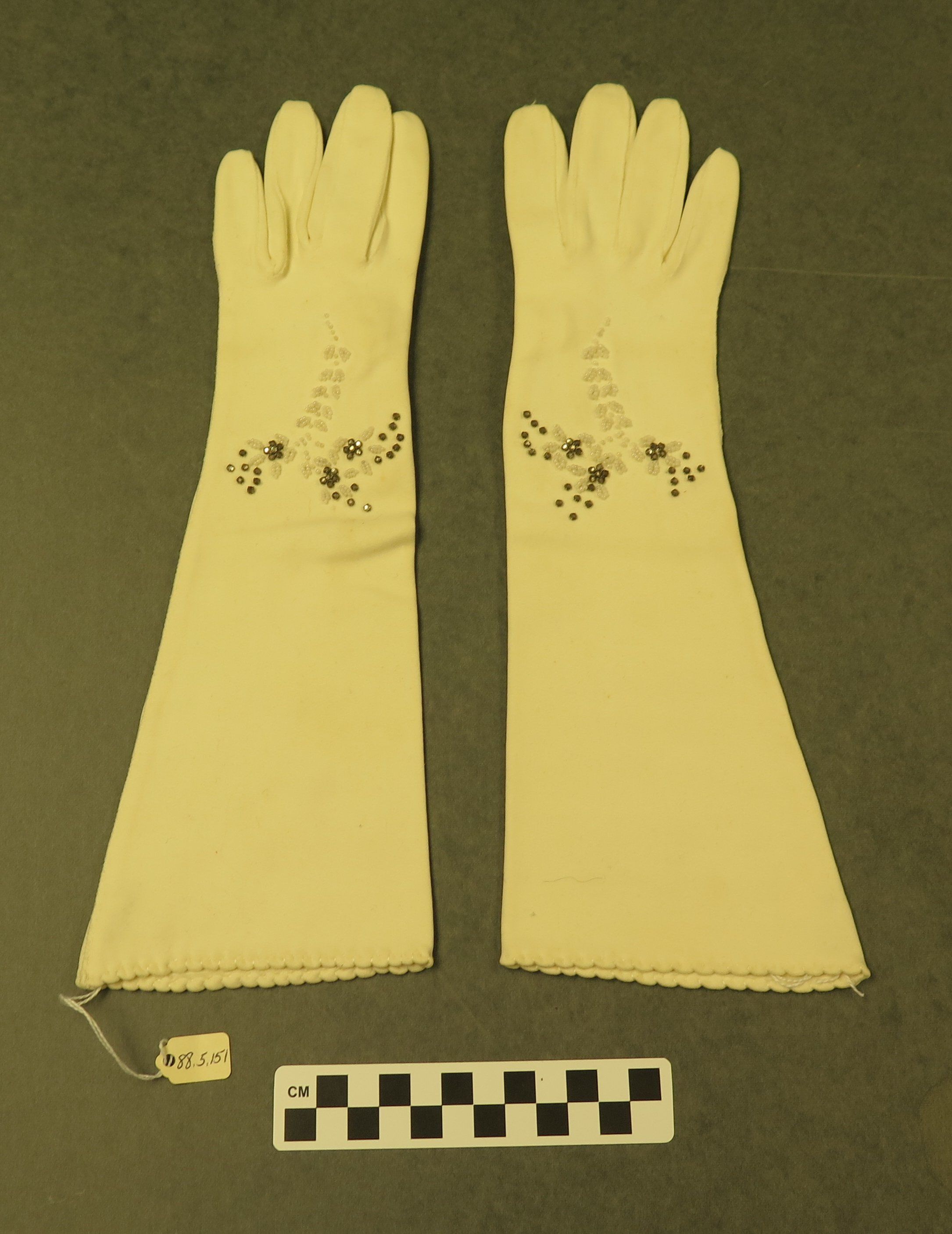 This is a pair of white women's gloves with rhinestones and white beads on the back. The gloves each measure 4.5" (w) x 13.5" (l).