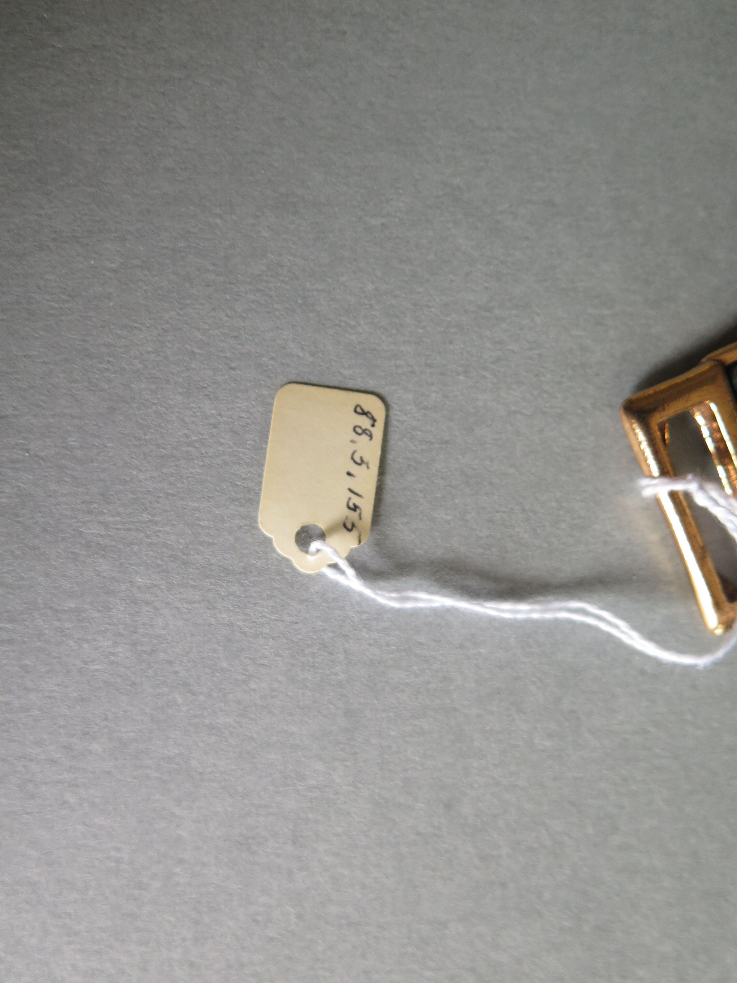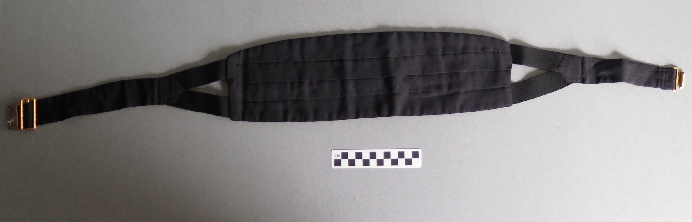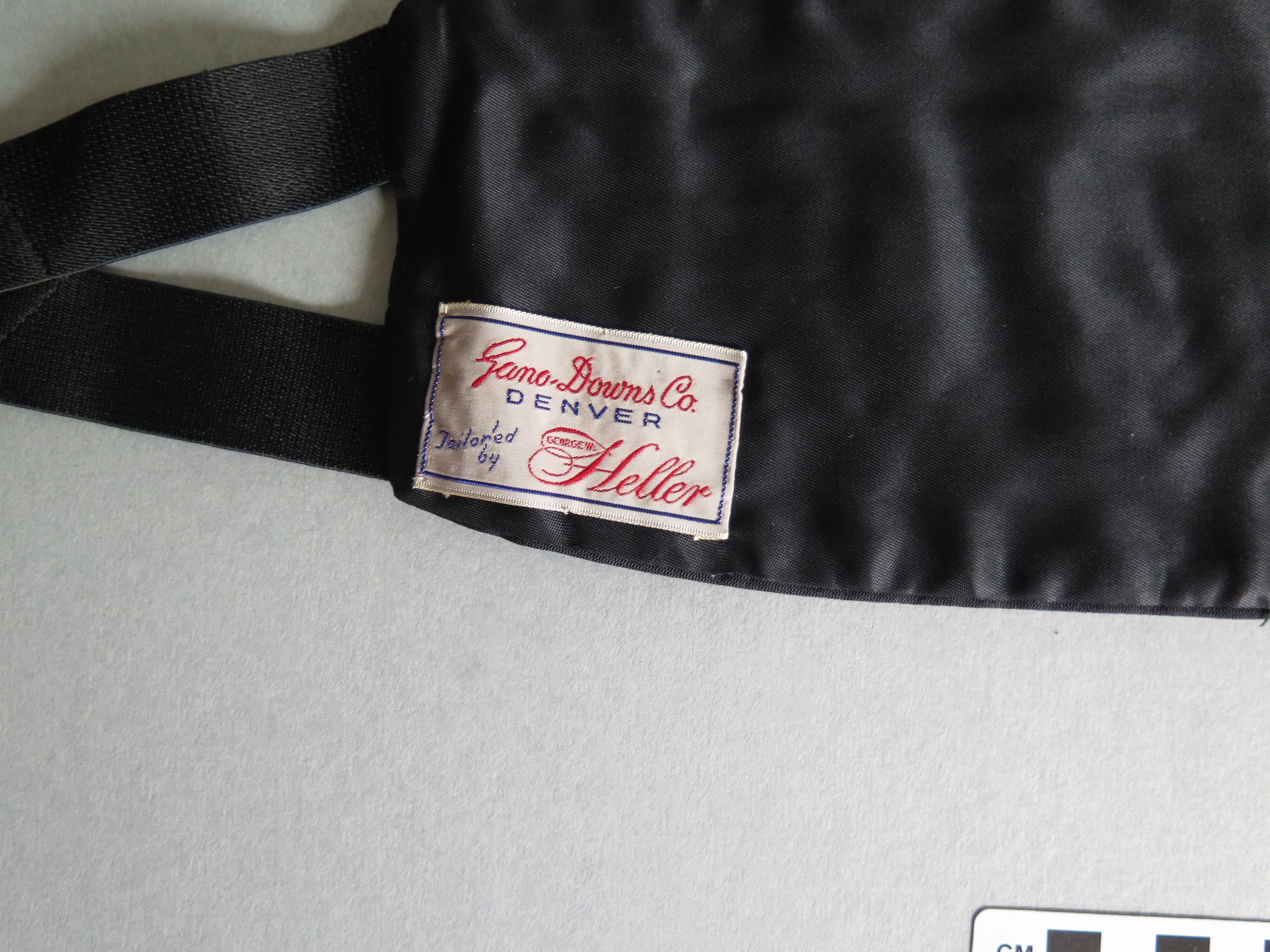 Black cummerbund with gold clasps in the back. Tag on the back of the cummerbund reads "Gano Downs Co. Denver Tailored by George W. Heller." Cummerbund measures 5" (w) x 38" (l).