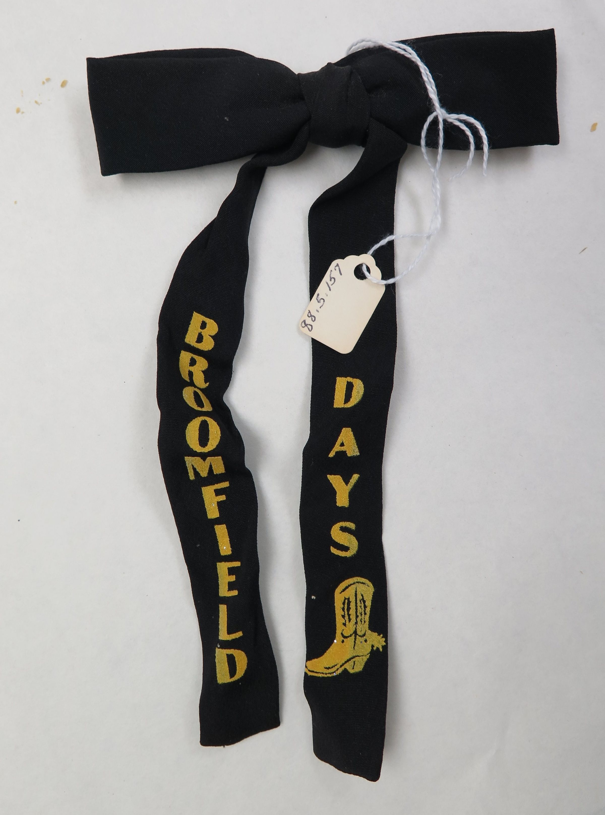 This is a bow tie from Broomfield Days. The bow tie is black with yellow text reading, "Broomfield Days" and a yellow image of a cowboy boot. The bow tie measures 4" (w) x 7" (l).