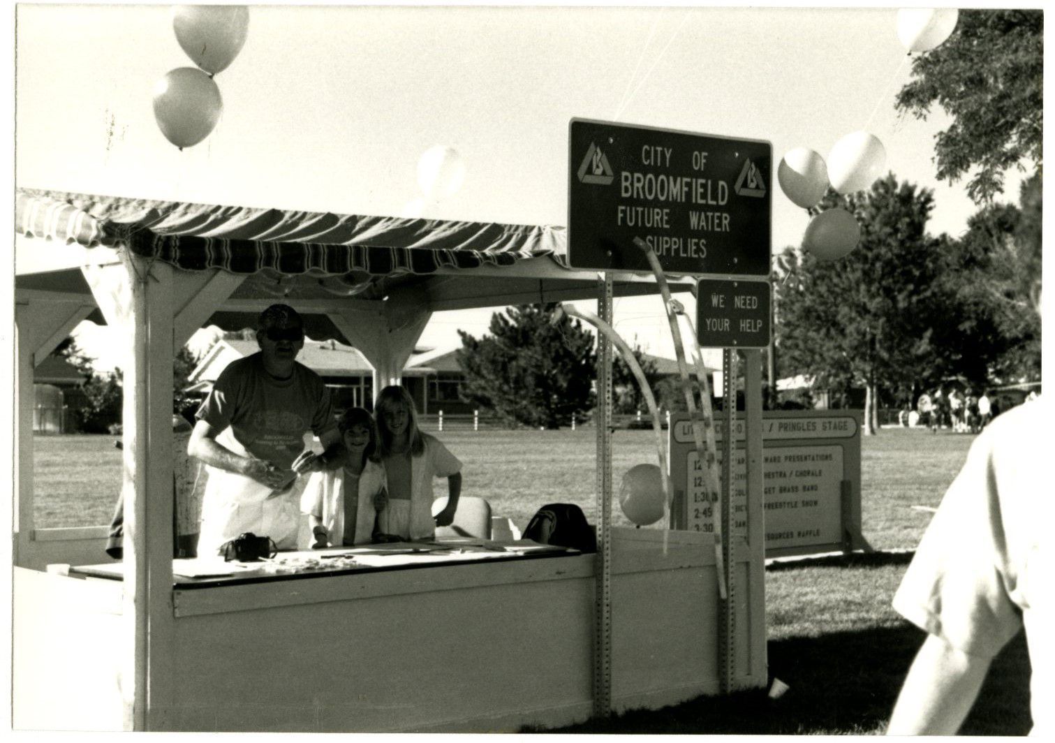 Item is a black-and-white photograph taken during the 1989 Broomfield Days event. The photo centers around a painted wooden booth with a striped fabric tent-like roof set up within a grassy field, which extends behind it for quite a bit. The booth has a sign above it that reads "City of Broomfield Future Water Supplies" with the county's logo. Below it is another sign that reads "We Need Your Help." Standing behind a table within the booth is a tall man with sunglasses and two young girls, who have posed for the photo by smiling and putting their arms around each other. The booth is decorated with balloons, and the shoulder of a bystander is visible in the bottom right corner of the image. Some homes and large trees, as well as more festivity booths, are visible in the distant background.Photograph Details