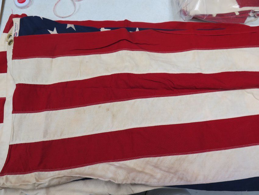 This is a US flag with 13 red and white stripes, a blue square in the top left with 50 white embroidered stars. The flag measures 48" (w) x 72" (l).