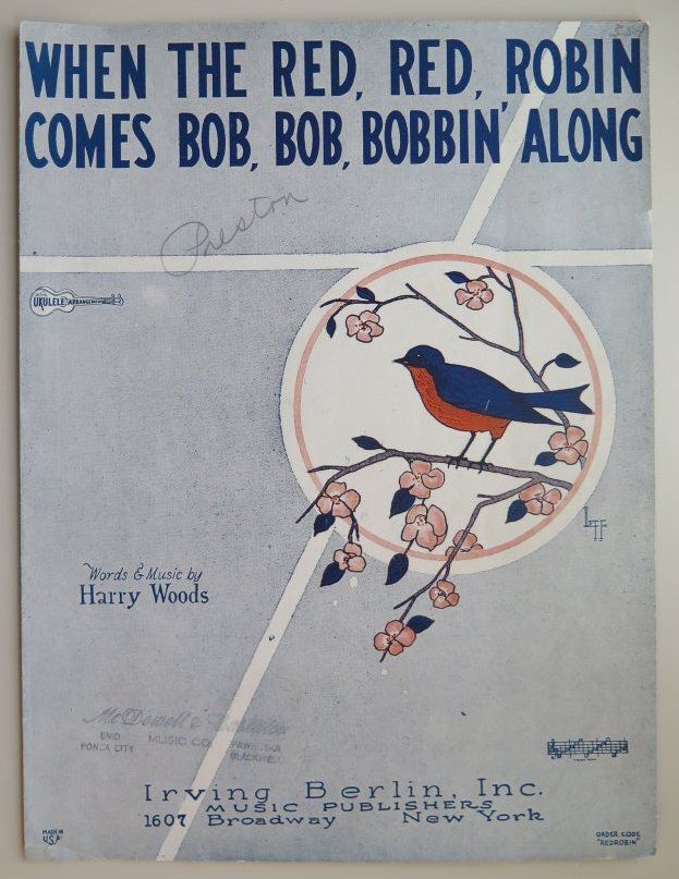 sheet music, "When the Red, Red Robin Comes Bob, Bob, Bobbin' Along" by Harry Woods. Music is in good condition. Minimal ripping on the innermost corner. No stains.