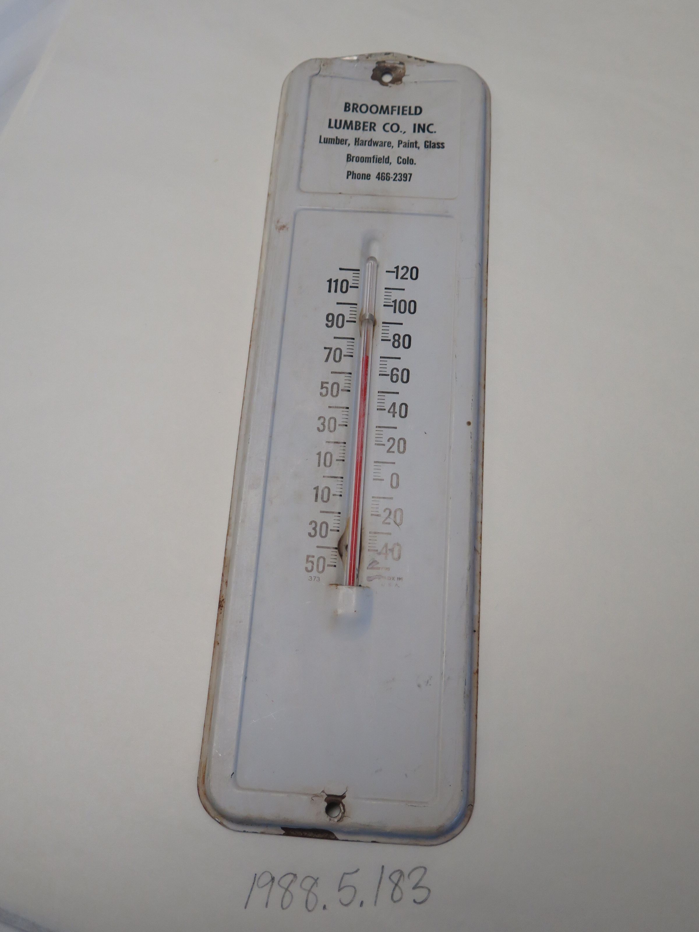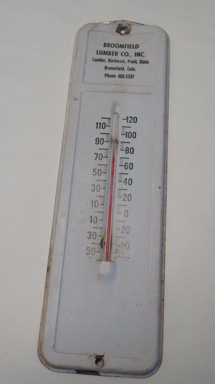The is a white 11" (h) x 3" (w) thermometer. Text reads "Broomfield Lumber Co. Inc."Collection