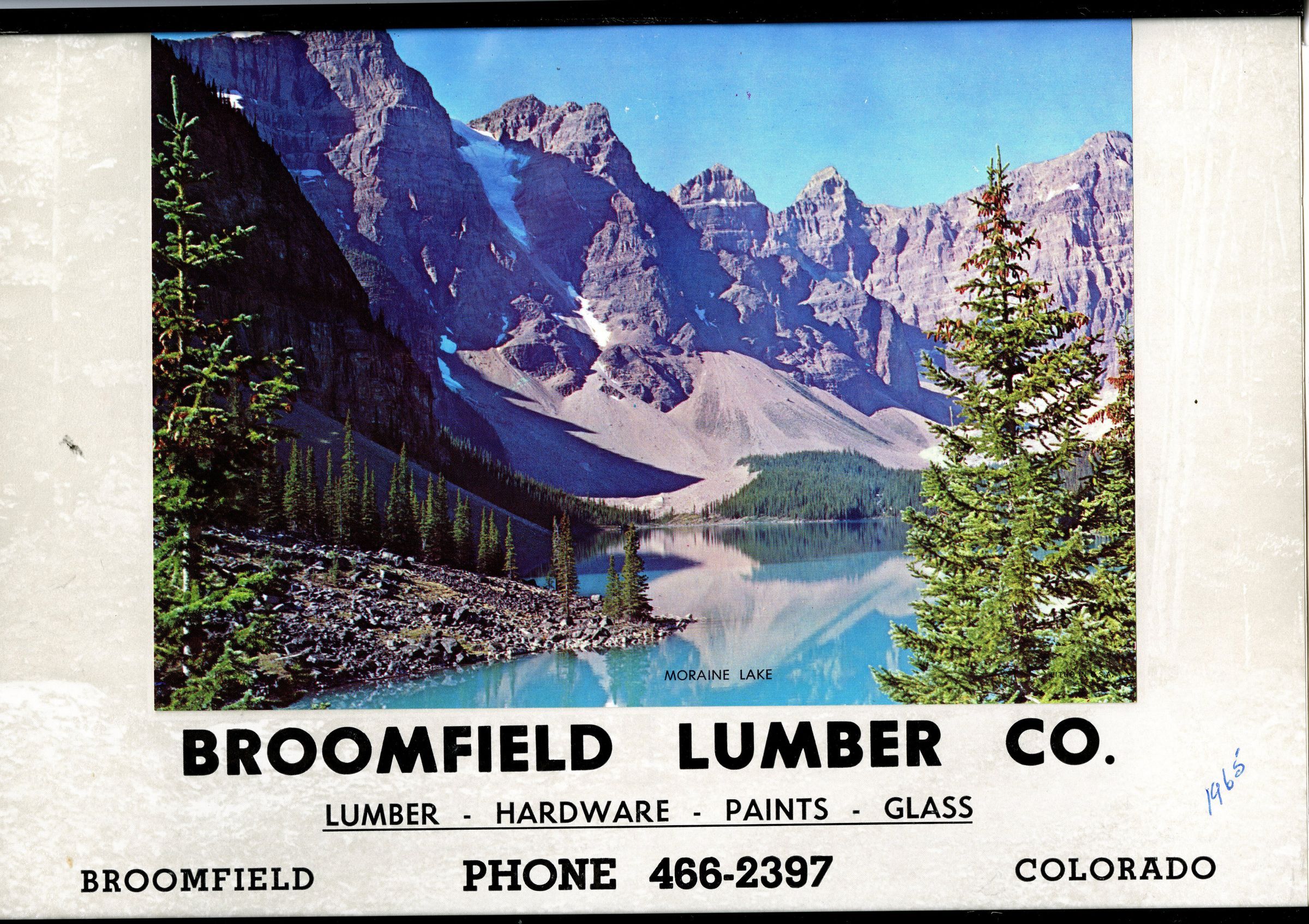 Broomfield Lumber Company calendar. The front cover has a picture of the Moraine Lake. There are handwritten notes on each calendar page.
