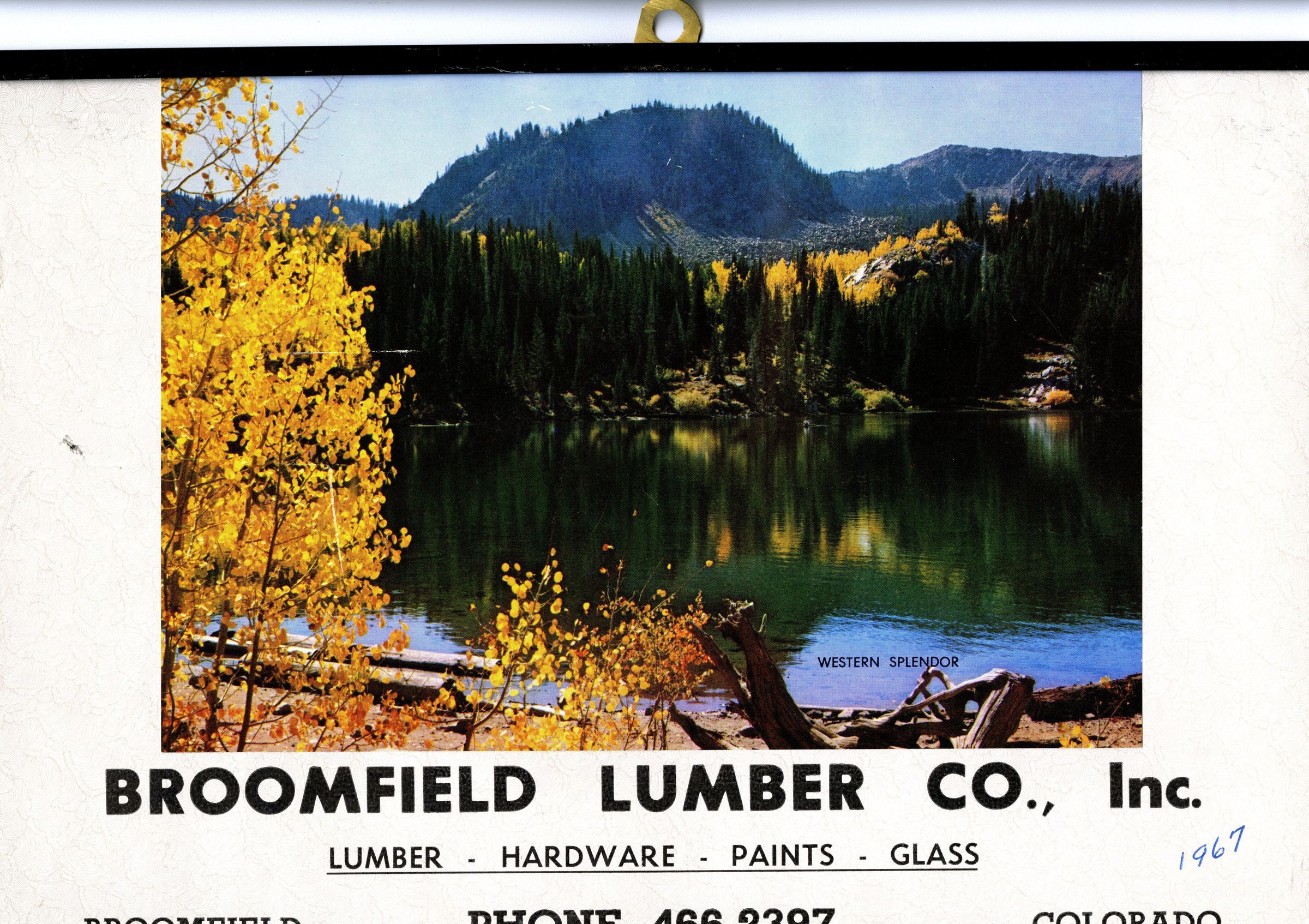 Broomfield Lumber Company calendar 1967. The front cover has a picture of the Western Splendor. There are handwritten notes on every page. The back cover is torn at the bottom.