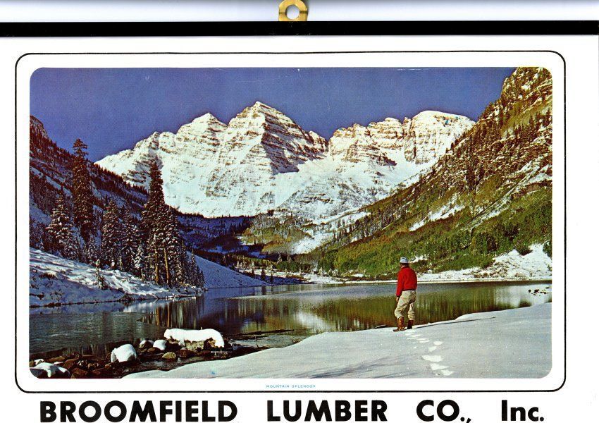 Broomfield Lumber Company calendar. The front cover has a picture of Mountain Splendor. There are written notes on almost every month. A torn piece of paper is clipped to September.