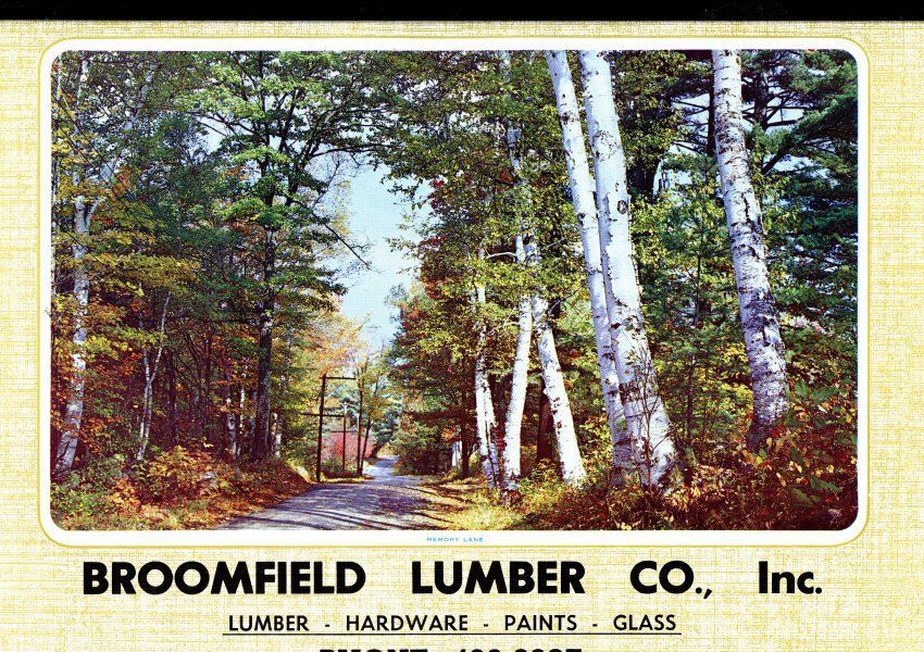 Broomfield Lumber Company calendar. The front cover features a picture of the Memory Lane. Handwritten notes are found on months from June through December. Some of the pages are foldable.