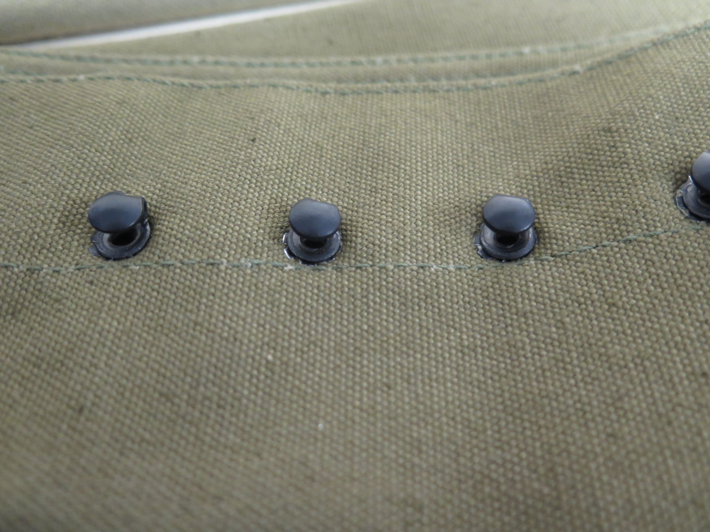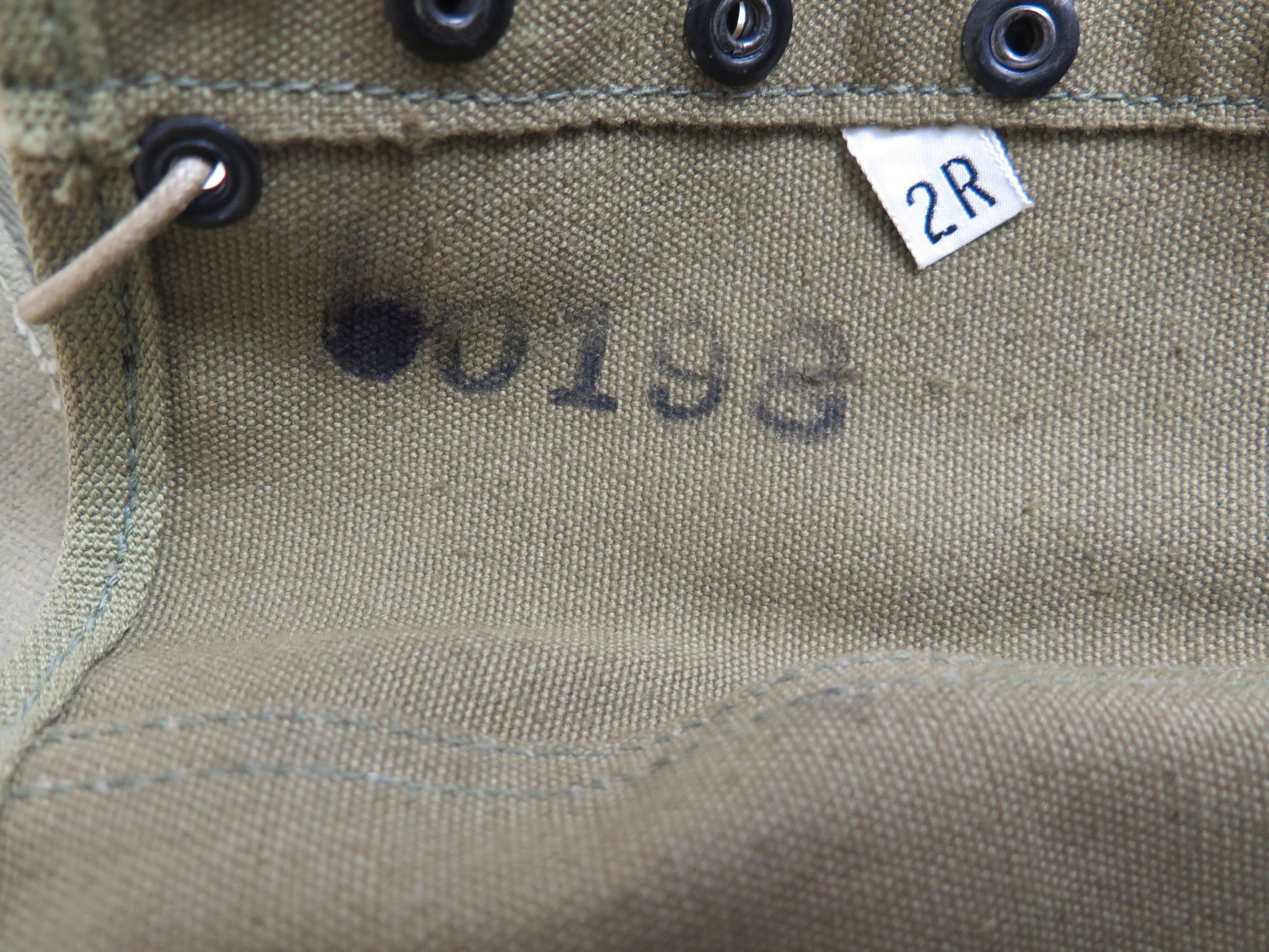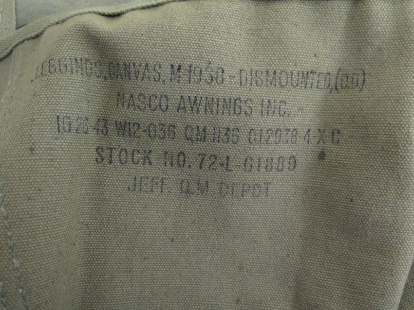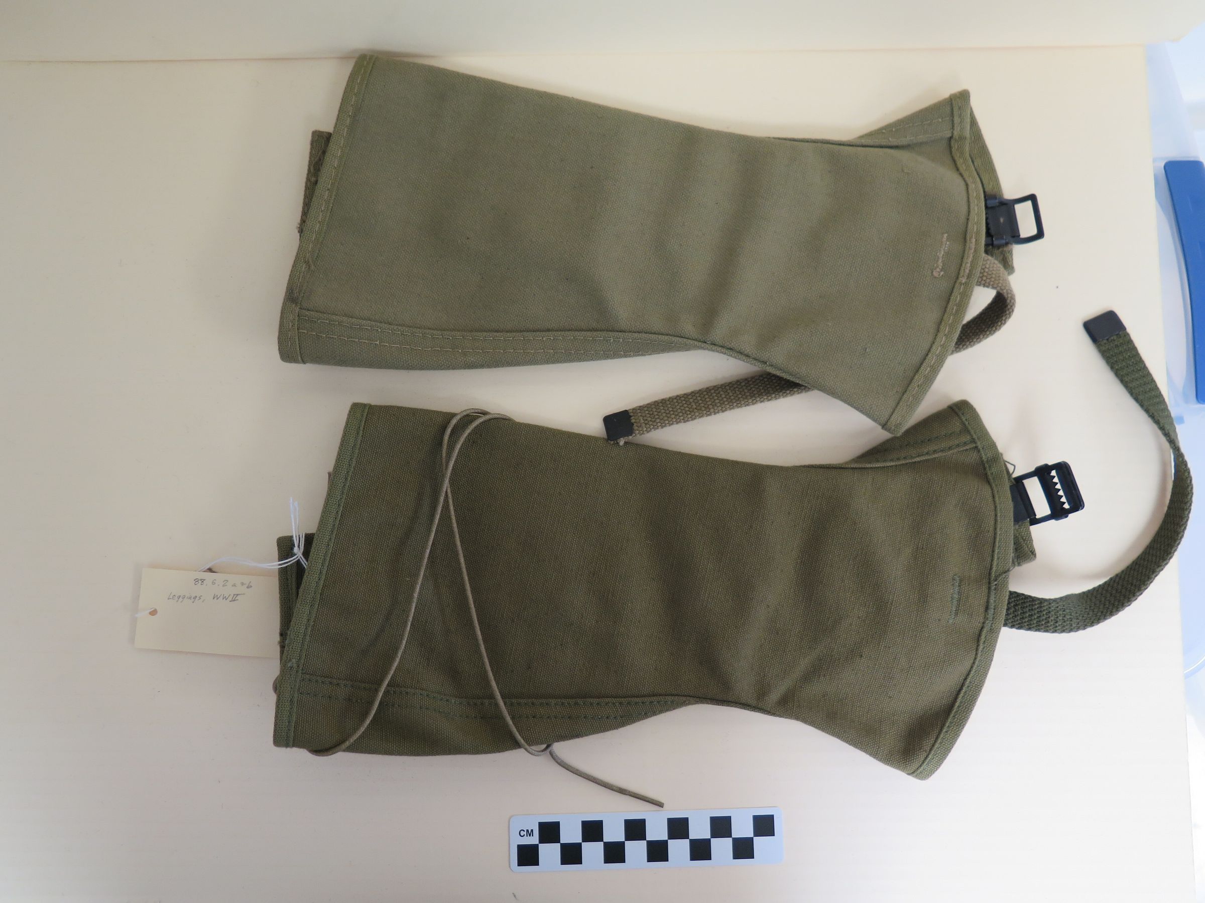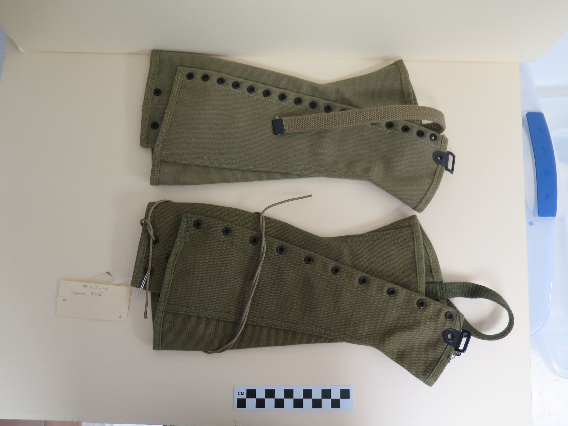 This is a set (part a and b) of olive canvas military issue leggings from WWII. The leggings have metal hardware to lace them up. They are stamped both on the inside and outside with black ink. Each legging measures 6" (w) x 14" (l) when folded. Gordon Blaker, Fort Sill curator, recommends we consider transfering this.