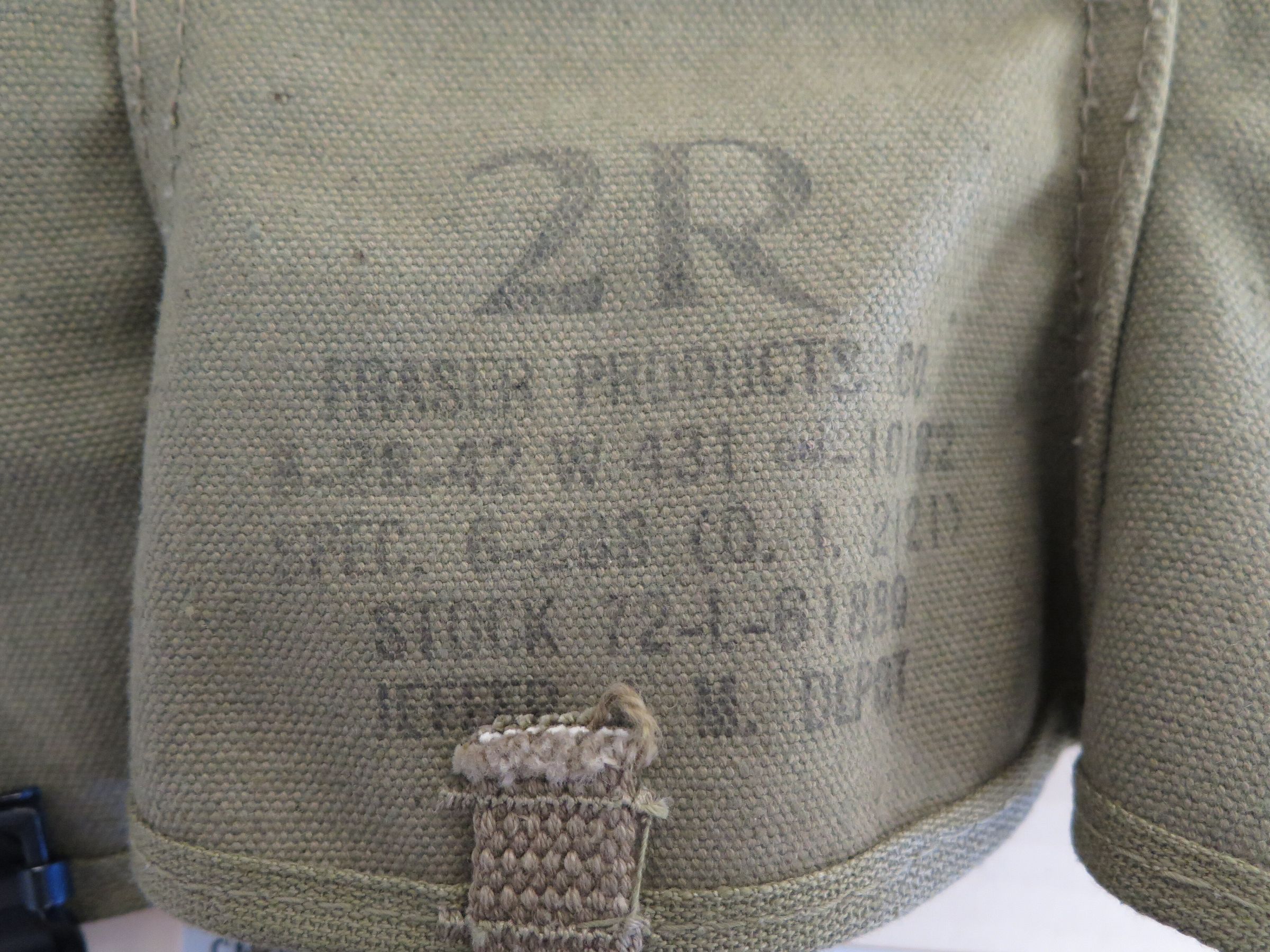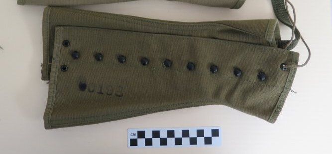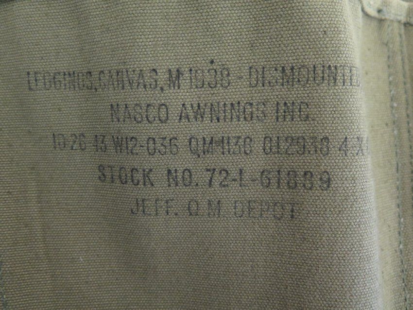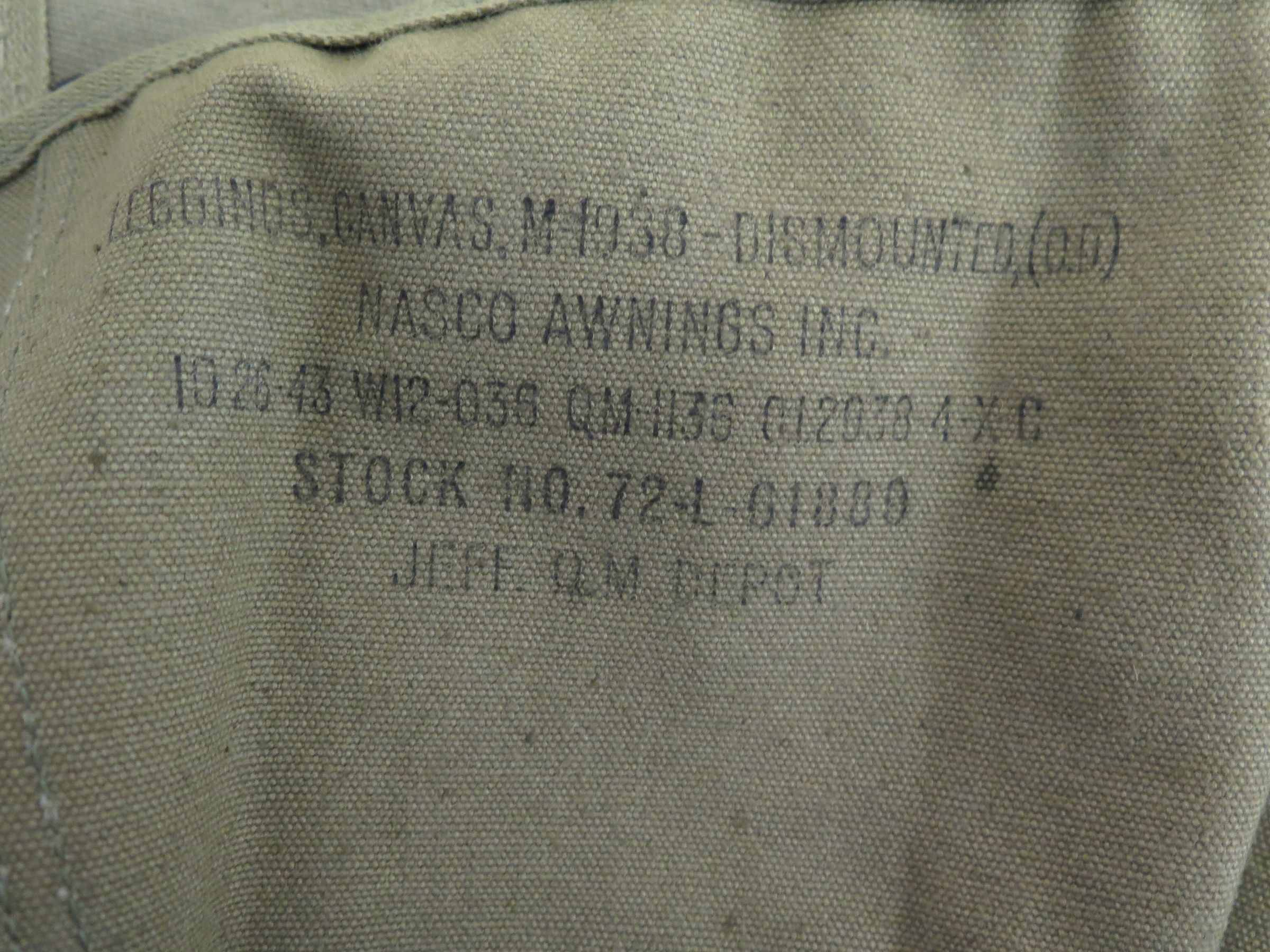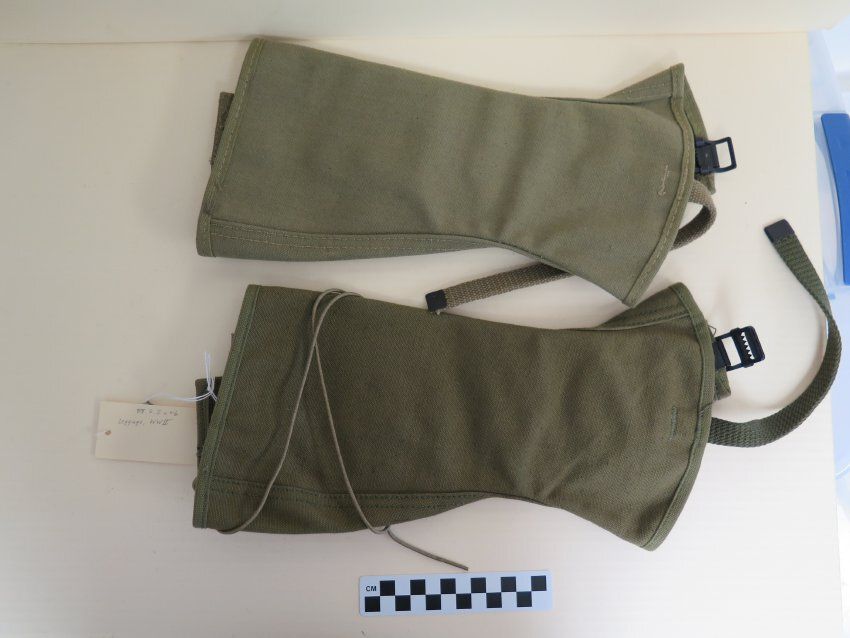 This is a set (part a and b) of olive canvas military issue leggings from WWII. The leggings have metal hardware to lace them up. They are stamped both on the inside and outside with black ink. Each legging measures 6" (w) x 14" (l) when folded.
