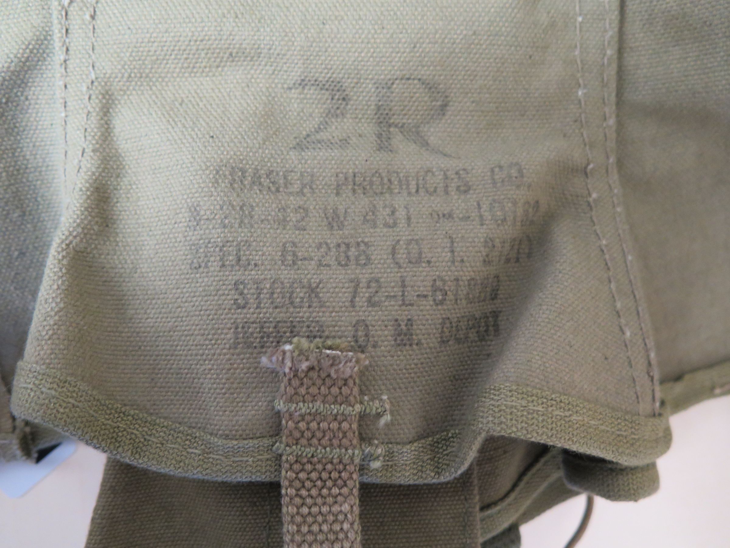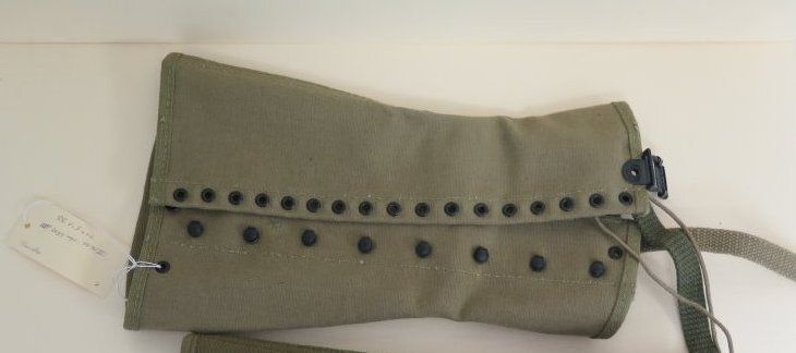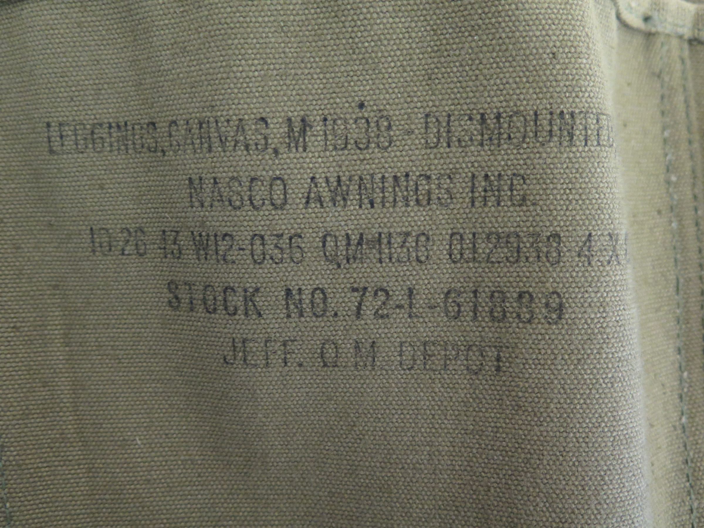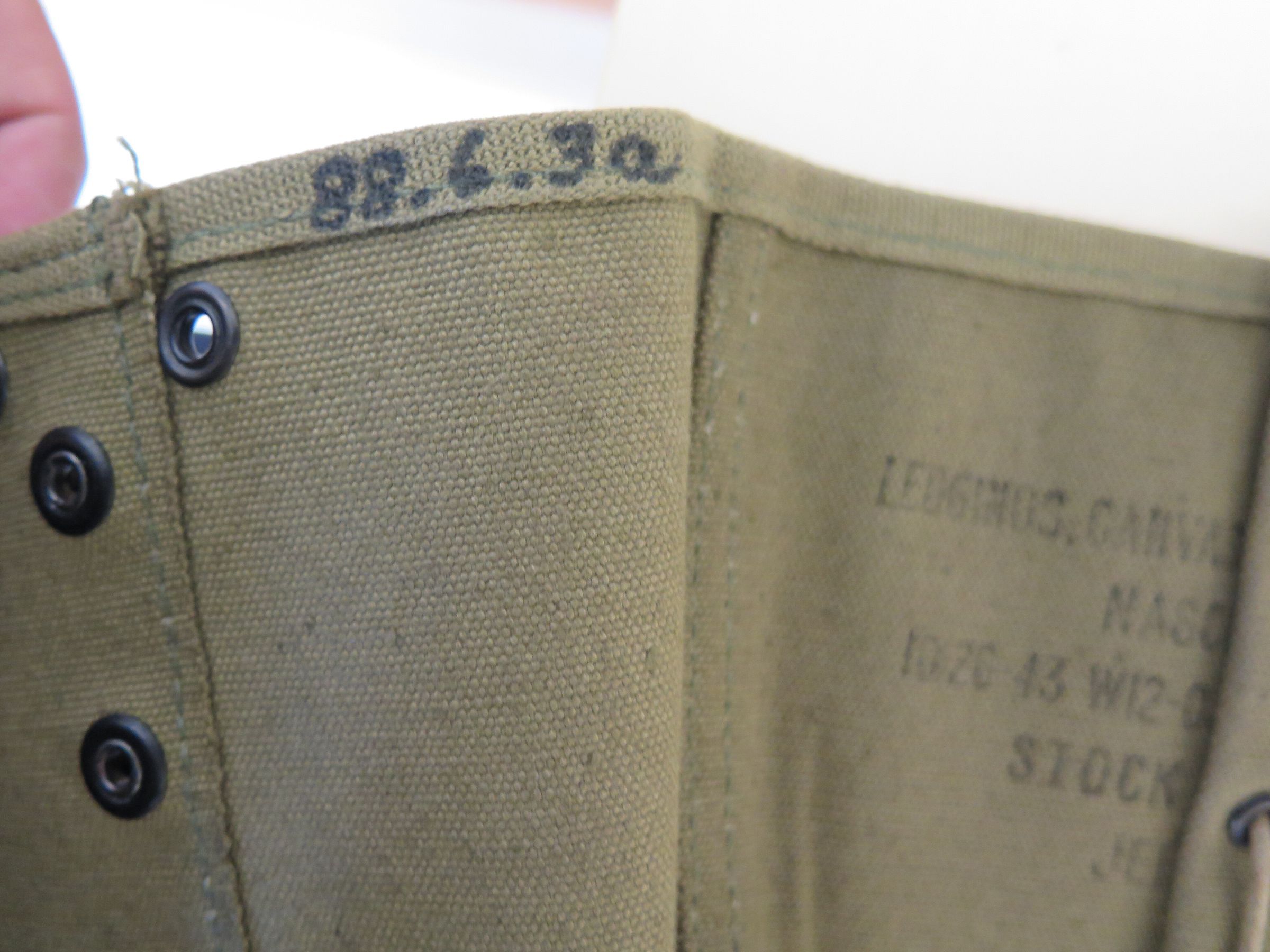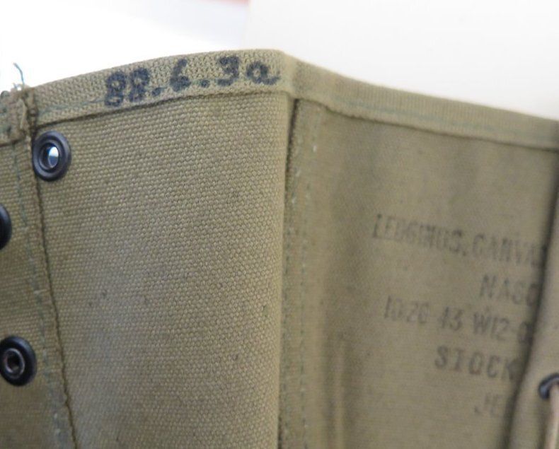 This is a set (part a and b) of olive canvas military issue leggings from WWII. The leggings have metal hardware to lace them up. They are stamped both on the inside and outside with black ink. Each legging measures 6" (w) x 14" (l) when folded. Gordon Blaker, Fort Sill curator, recommends we consider transfering this.