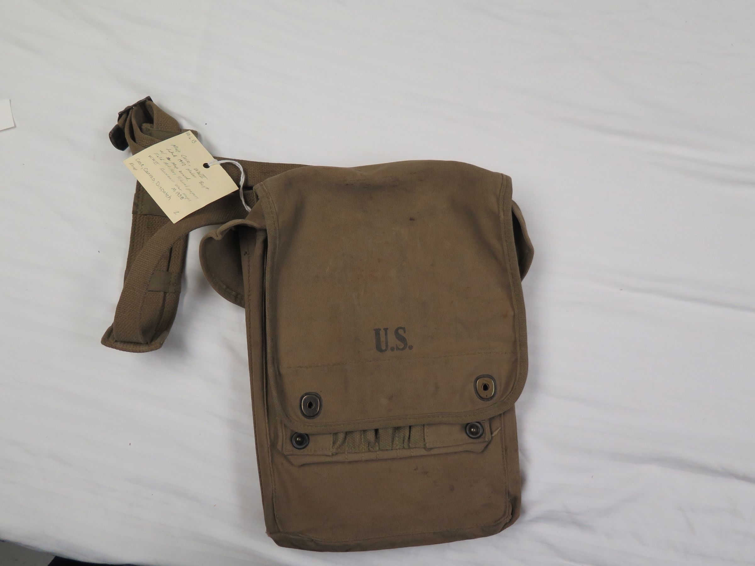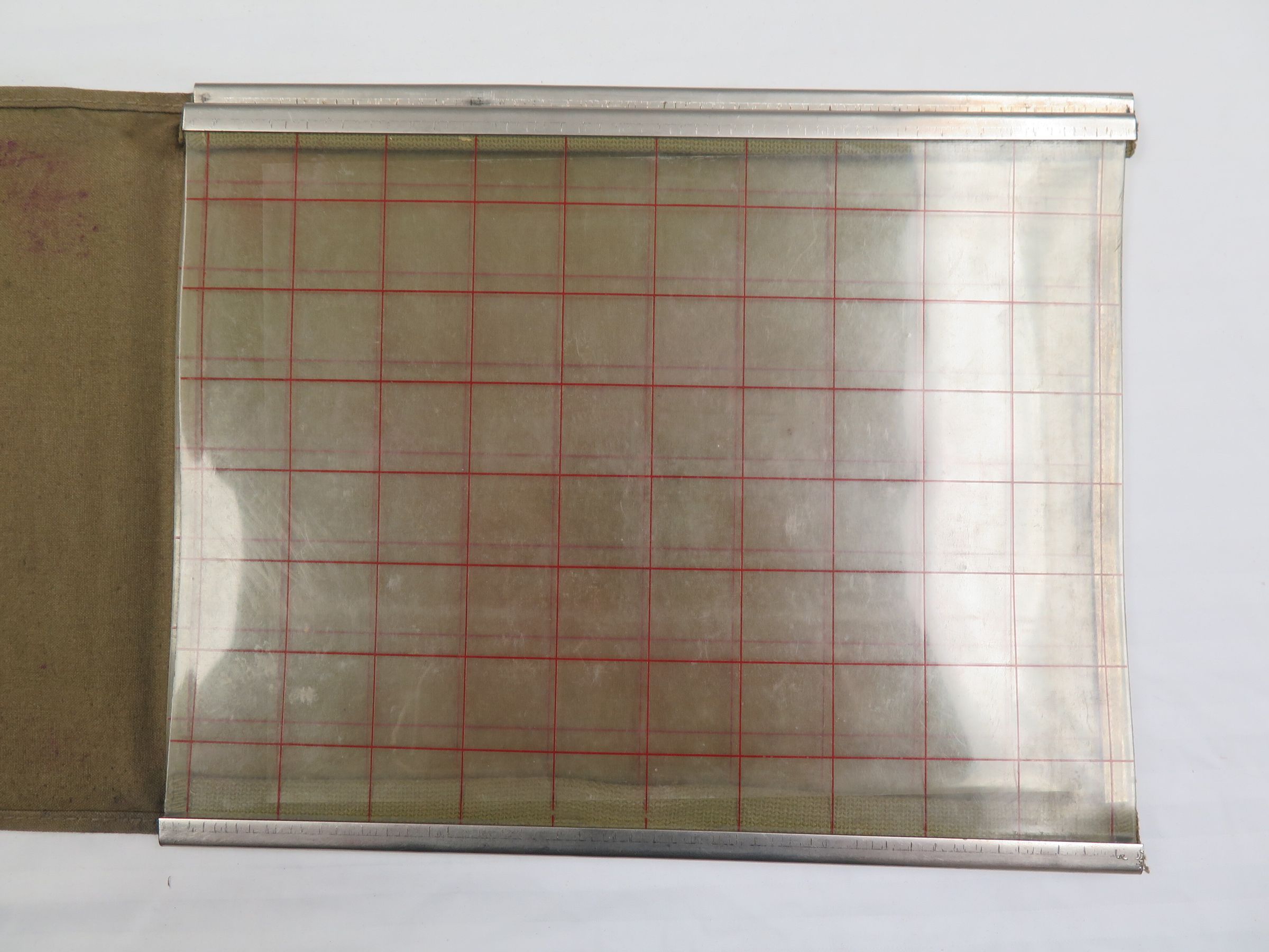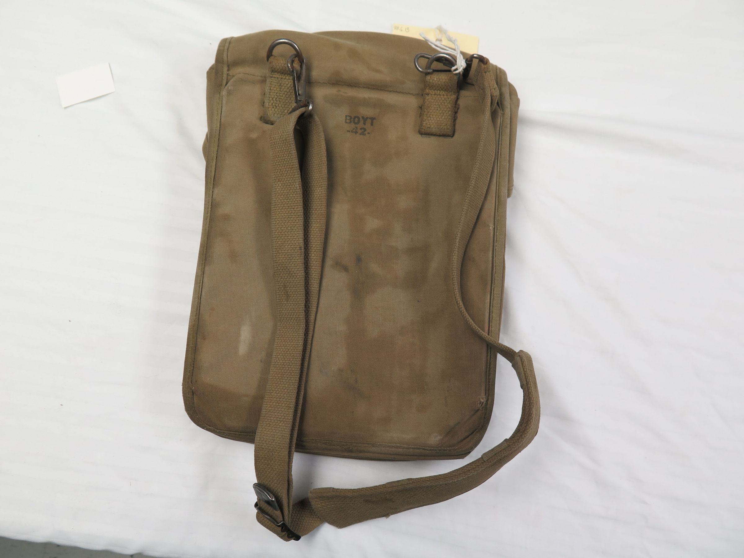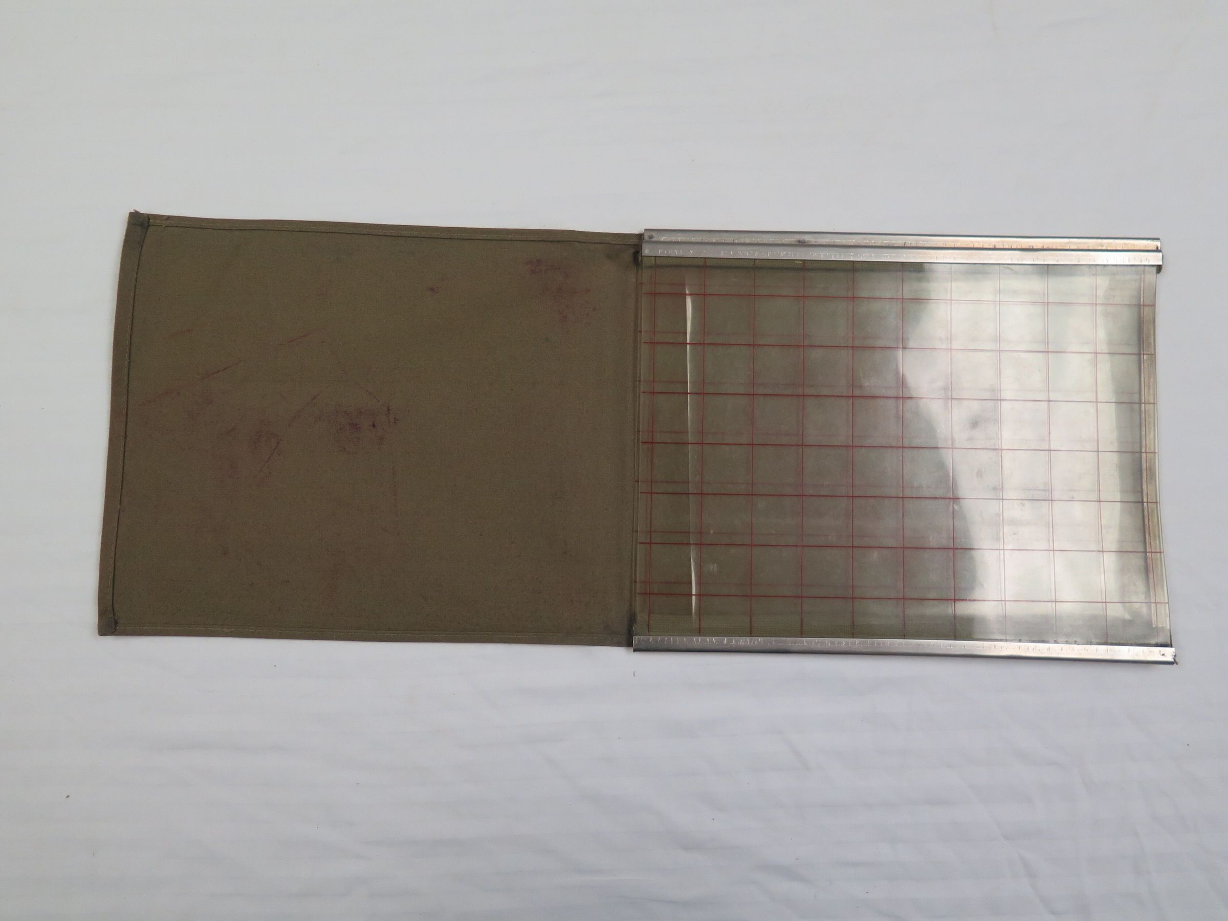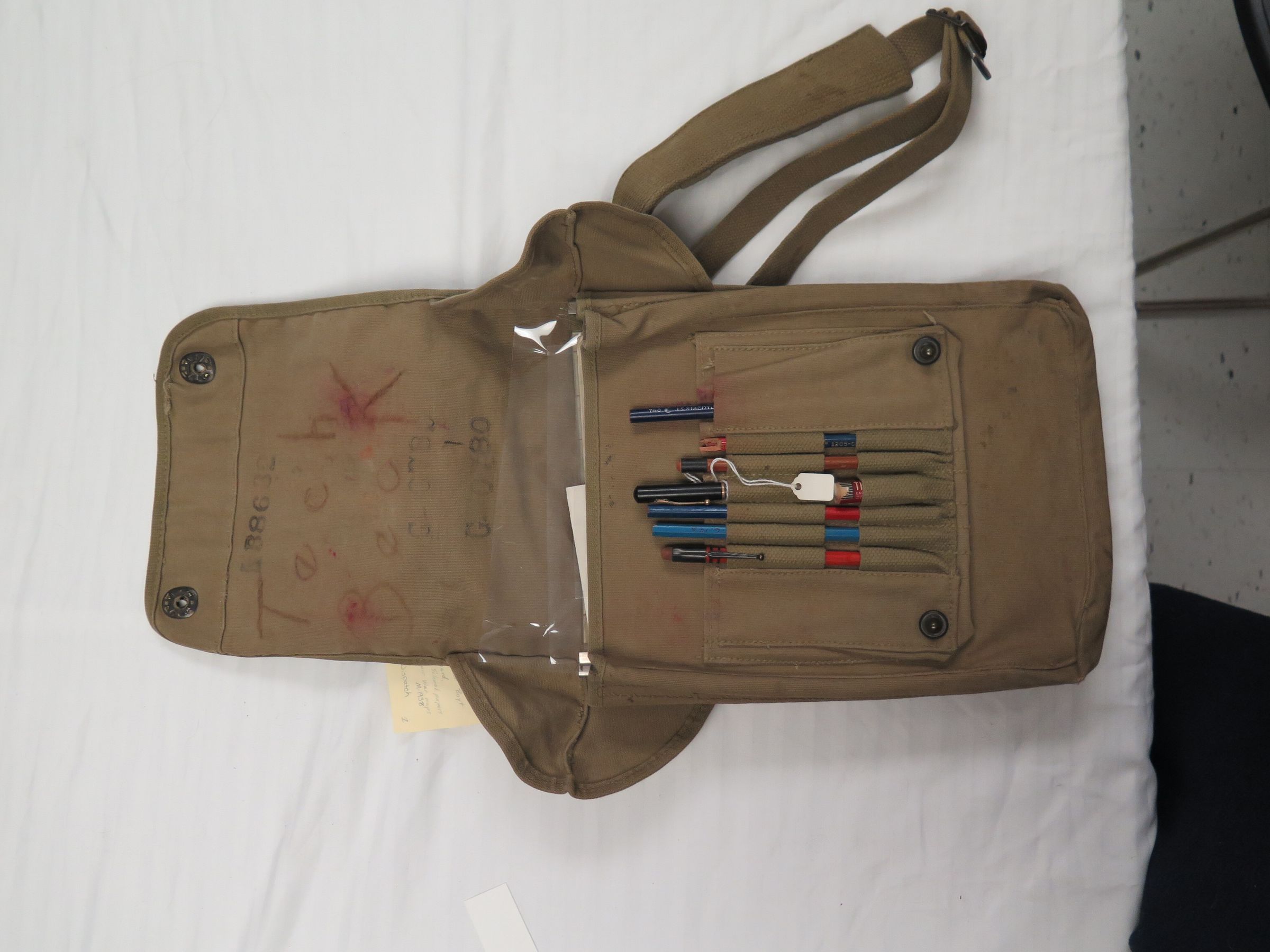 This is a khaki map kit bag. The bag is military issue. The front of the bag has a stamp that reads, "US". The back of the bag has a stamp that reads, "Boyd/ 42". The bag contains: map grid insert 1988.6.13a, pencils 1988.6.14a-h, and paper documents and maps 1988.6.16-24,1988.6.26, and1988.6.28-30. The map kit bag measures 16" (h) x 9" (w) x 2.5" (d). The grid measures 8.5" (w) x 10.5" (l).Collection