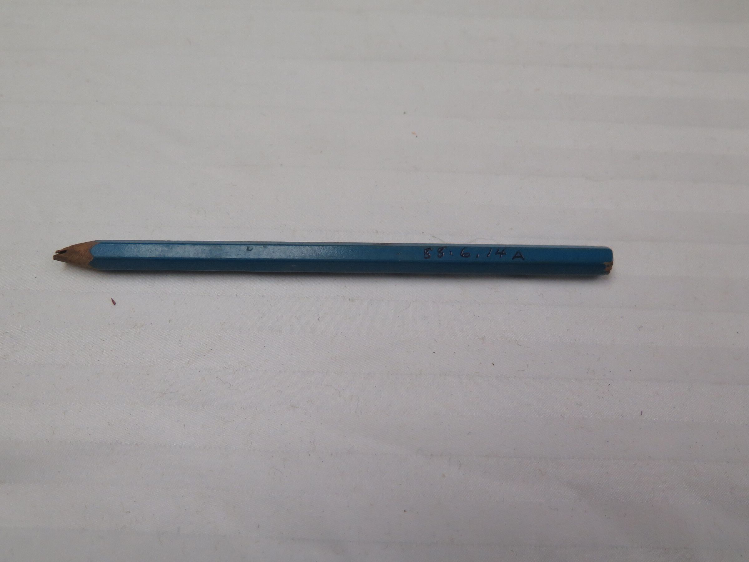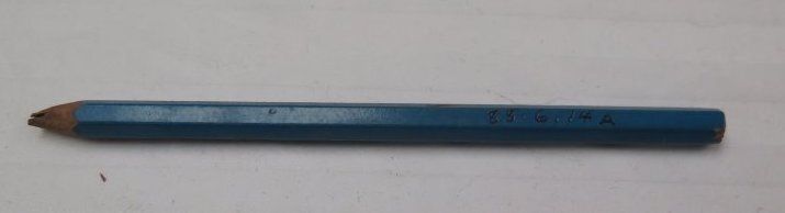 This is a blue wooden pencil with the lead tip broken and no eraser. The pencil measures 0.25" (w) x 5.25" (l). The pencil is stored inside of map case 1988.6.13.