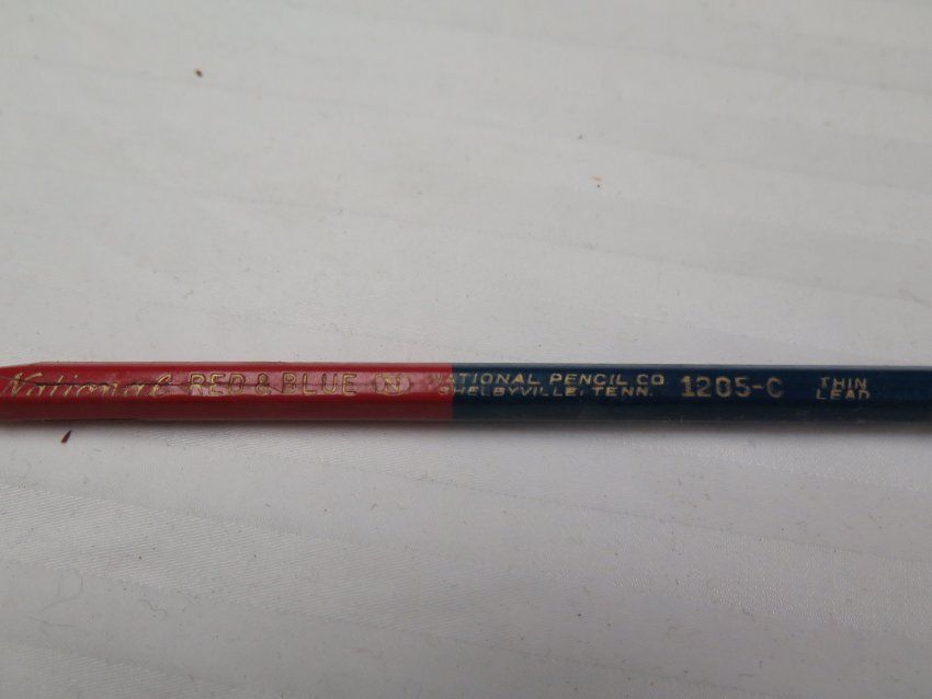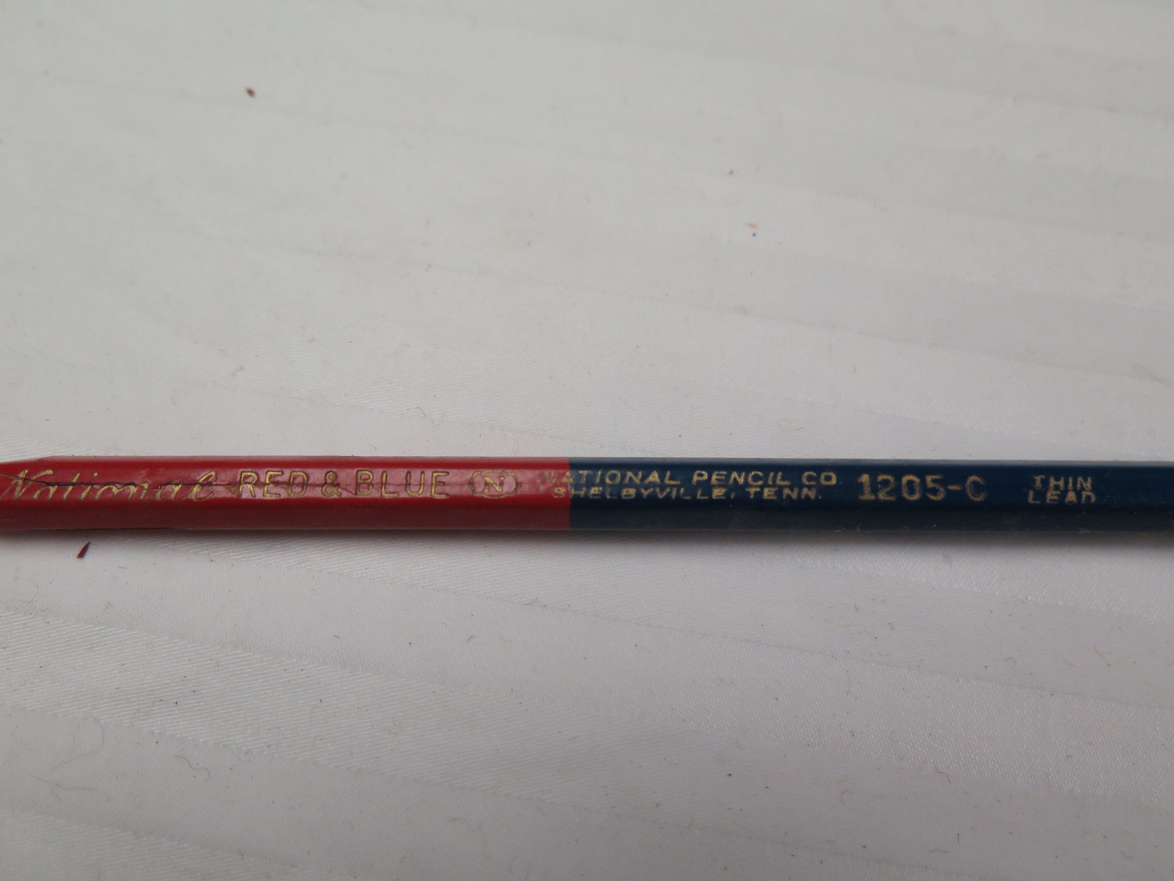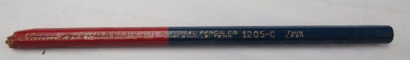 This is a broken red and blue pencil made by National Pencil Company. This pencil is a 1205-C with thin lead. The pencil measures 0.25" (w) x 6" (l). The pencil is stored inside of map case 1988.6.13.