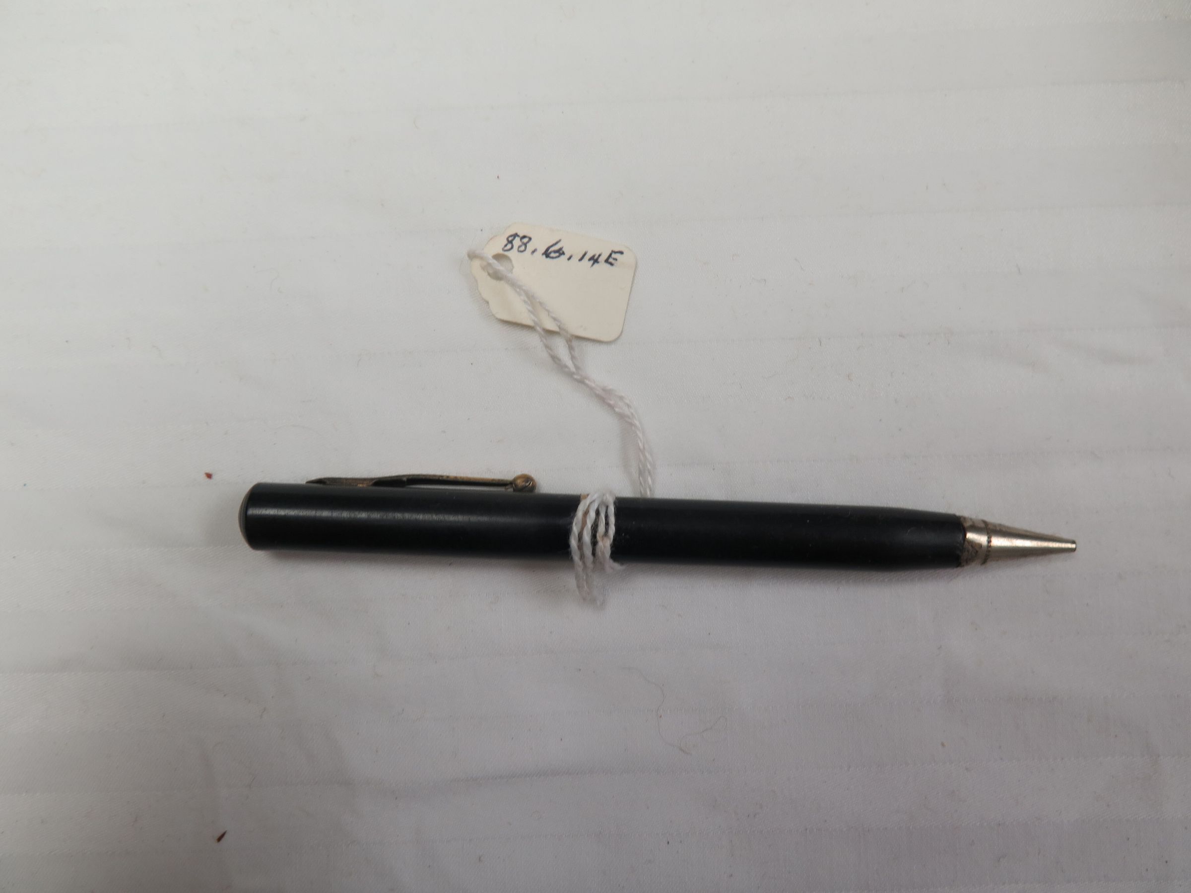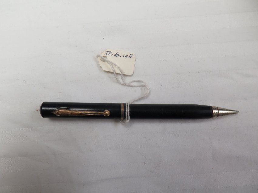 This is a black plastic mechanical pencil with a metal clip. The pencil measures 0.25" (w) x 4.75" (w). The pencil is stored inside of map case 1988.6.13.
