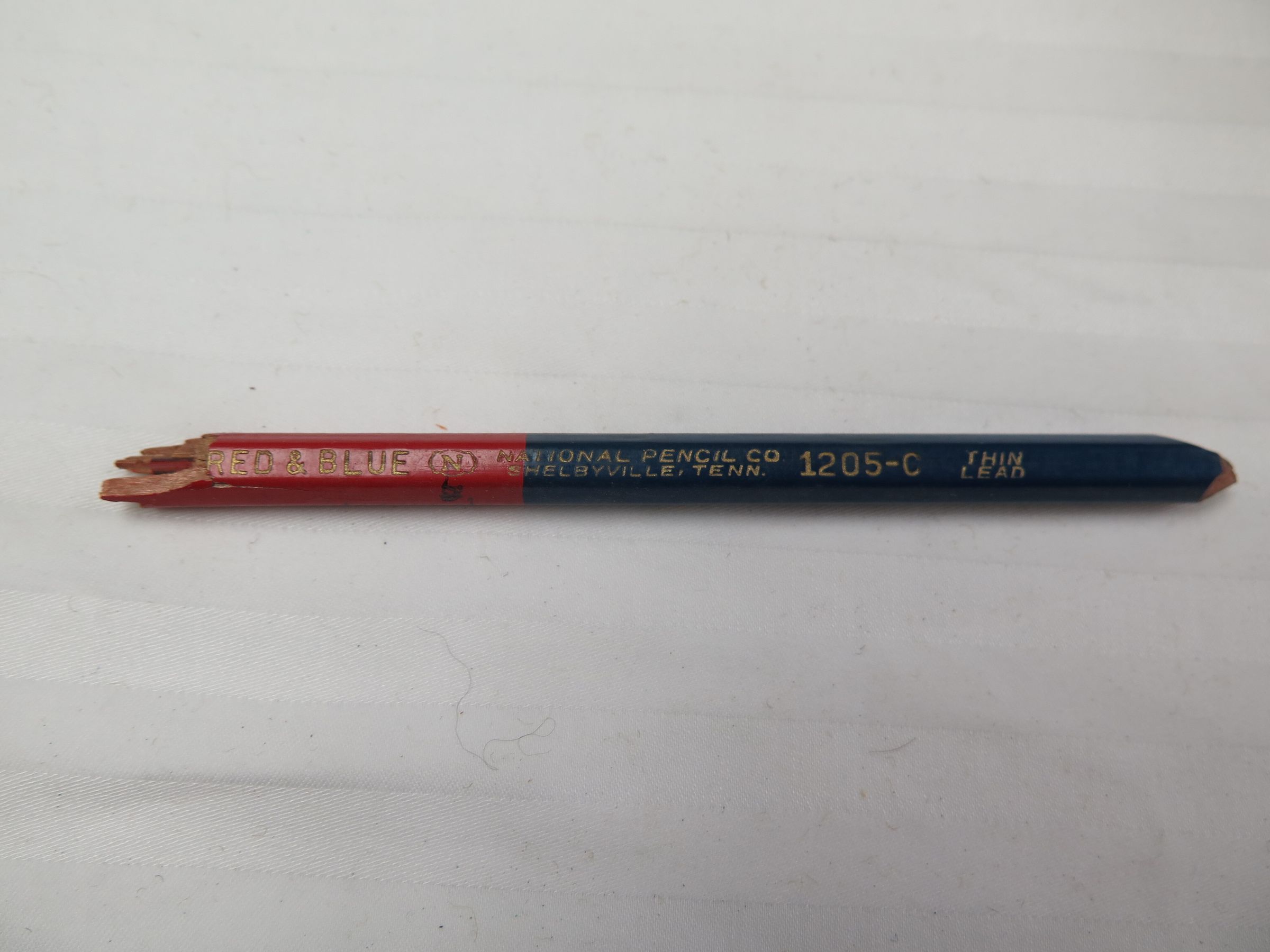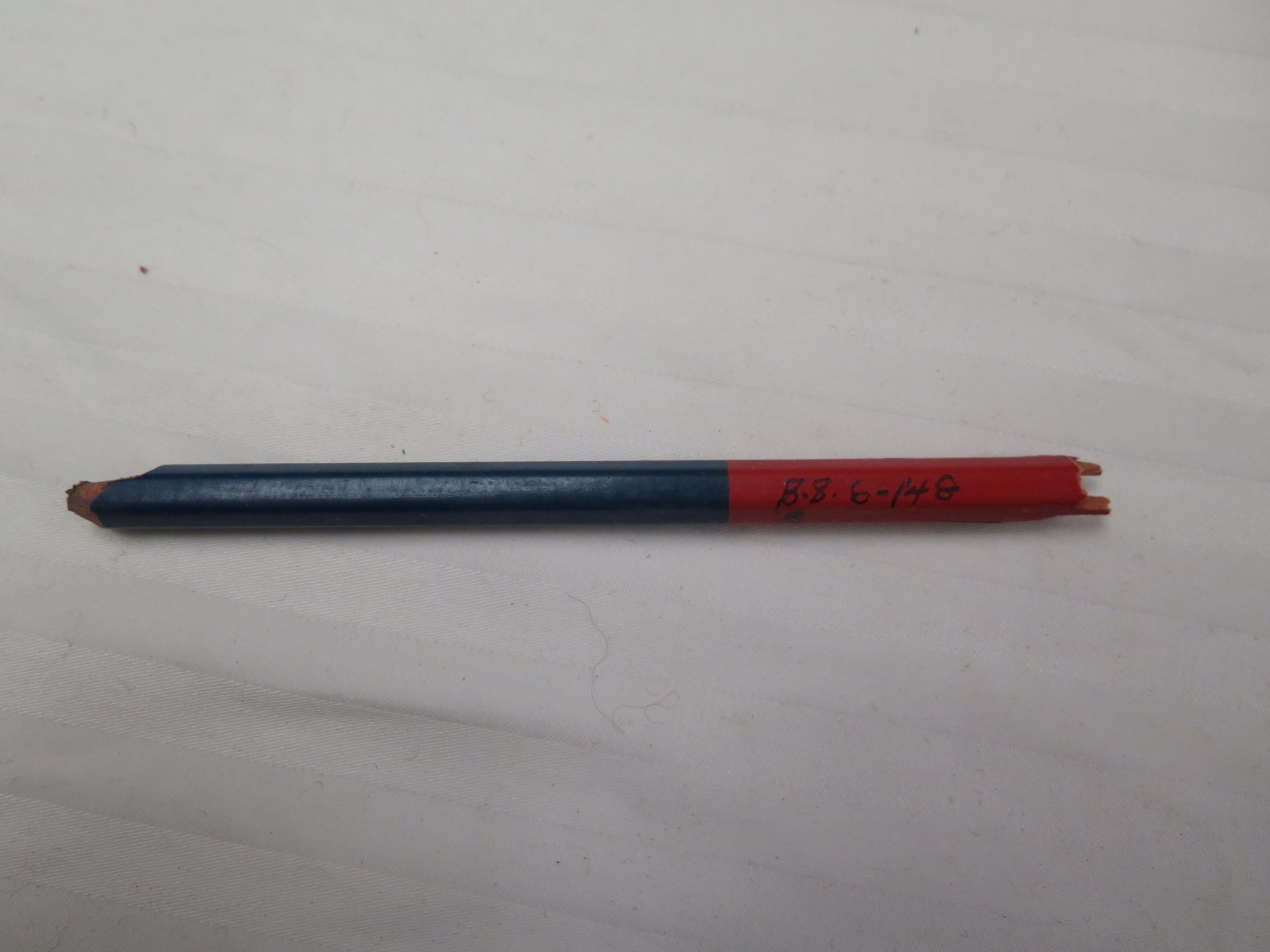 This is a red and blue pencil from the National Pencil Company. The pencil takes thin lead, and it is broken. The pencil measures 0.25" (w) x 4.25" (l). The pencil is stored inside of map case 1988.6.13.