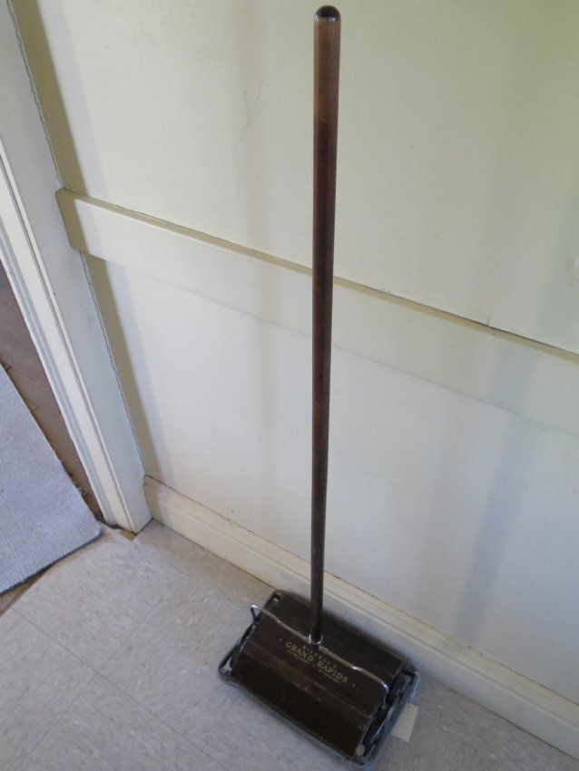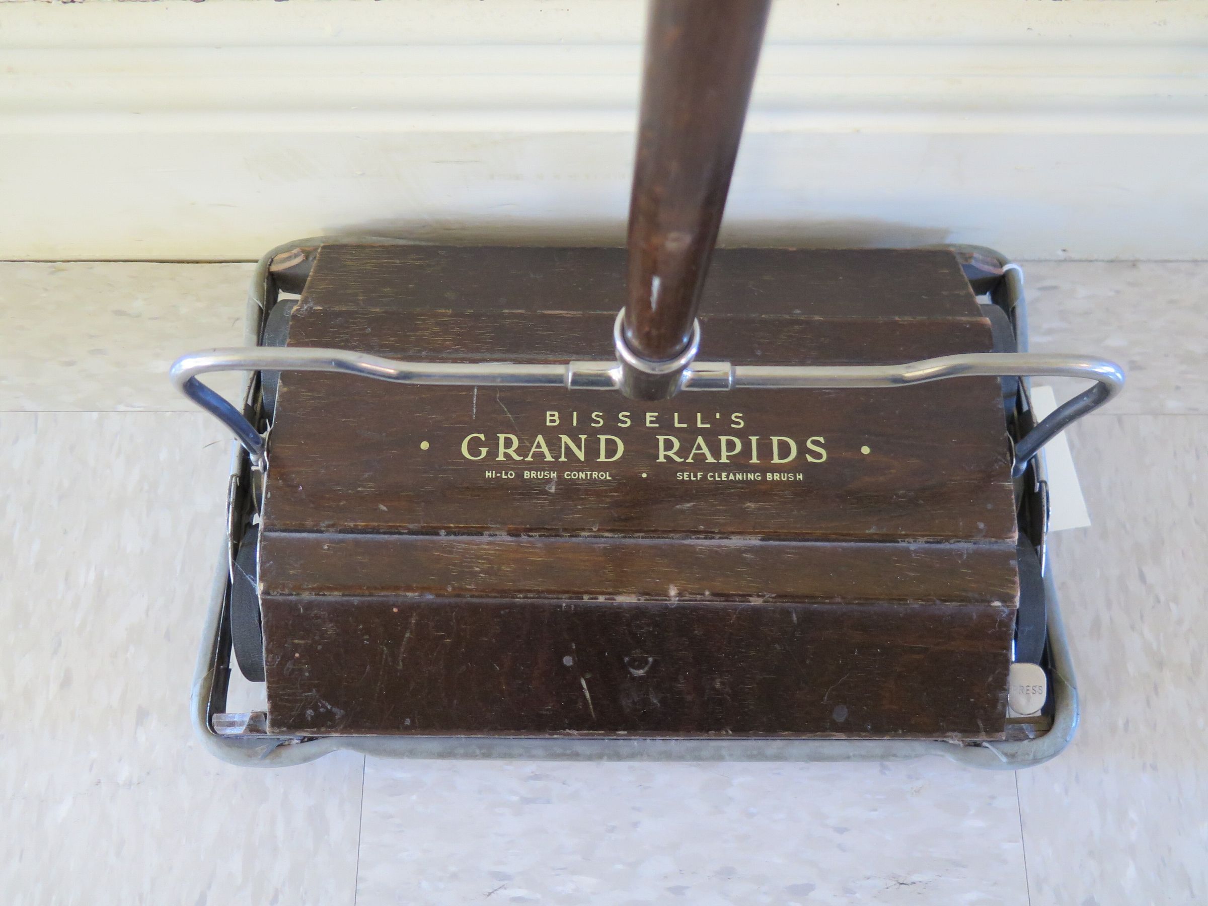 This is a Bissell brand Grand Rapids carpet sweeper. The carpet sweeper is made of stained wood. The gold text painted on the flat part of the carpet sweeper reads, "Bissell's's/ Grand Rapids/ Hi-Lo Brush Control/ Self Cleaning Brush" The carpet sweeper measures 52.5" (h) x 15.5" (w) x 10" (d).Collection