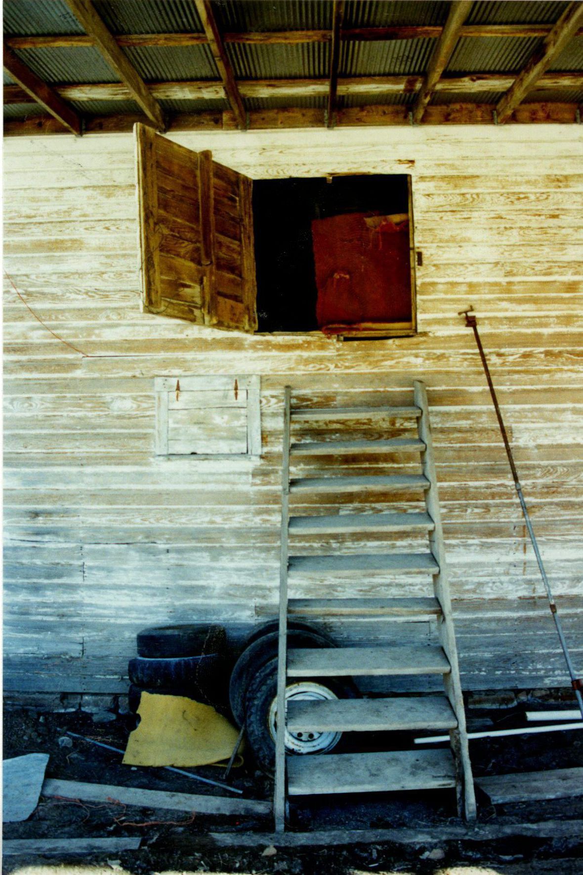Photo from Brunner Farm collection showing a side of a shed with a ladder and windowPhotograph Details