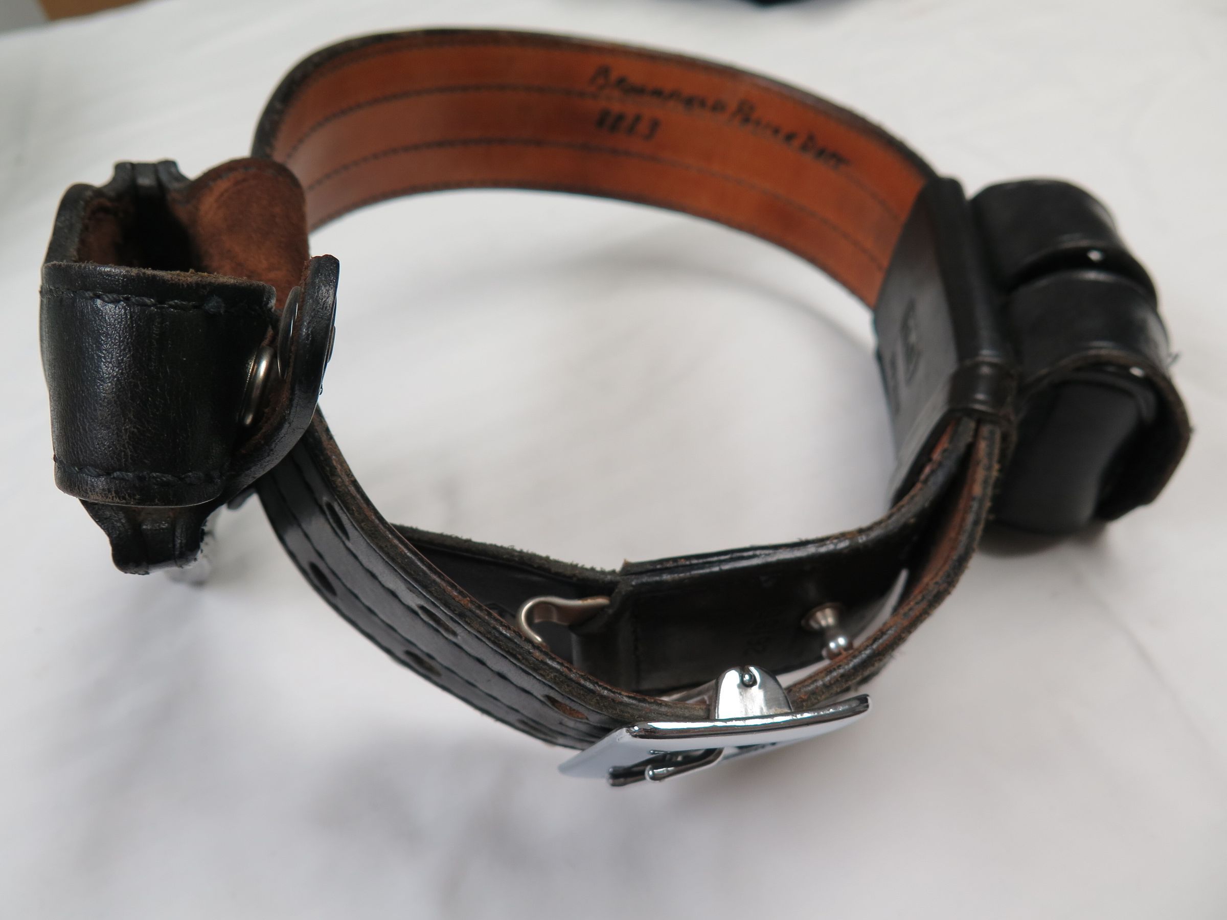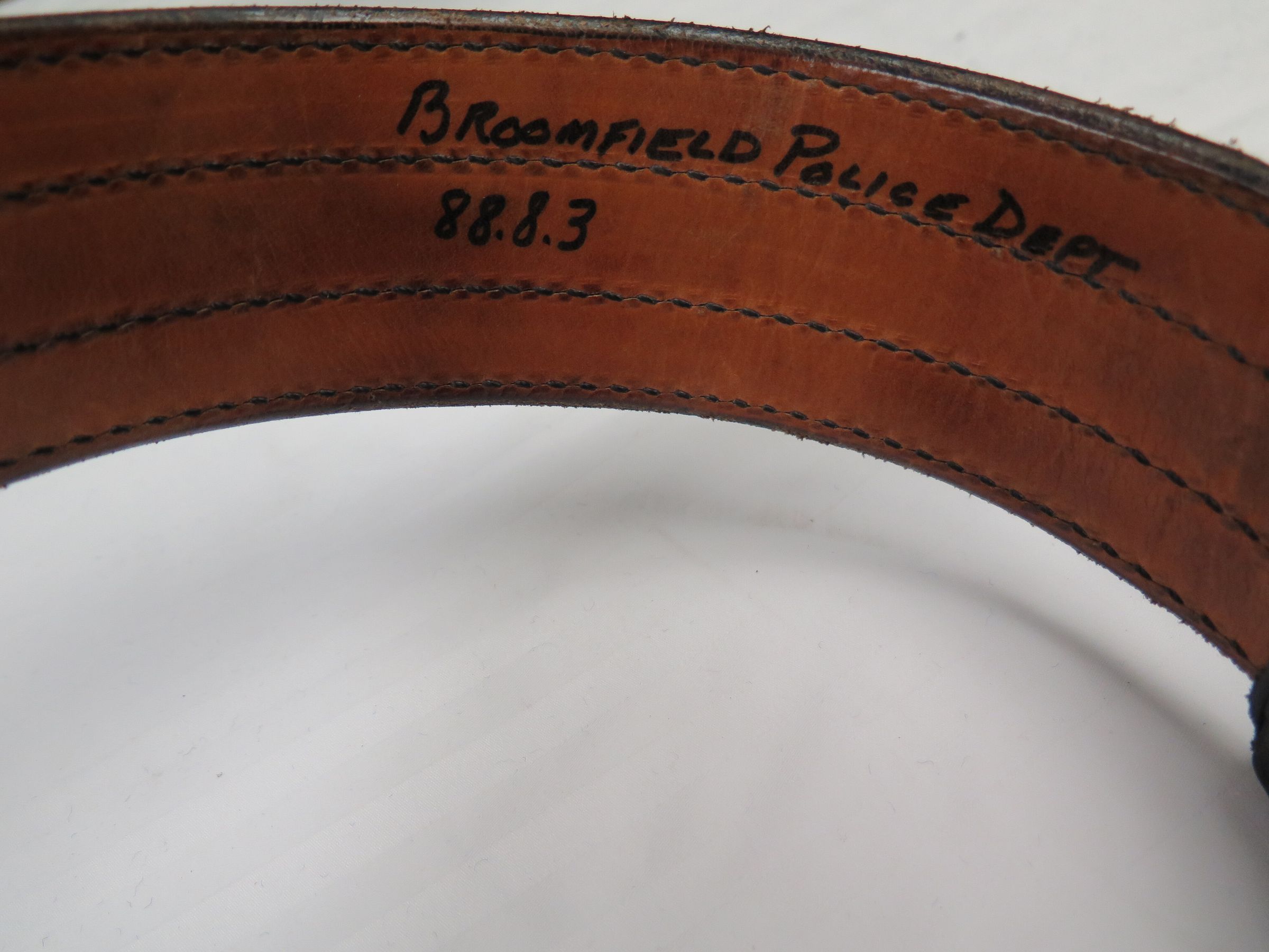This is a black and brown leather belt for police uniform with "Sam Brow" type quick loads. The belt has a gun holster on one side. The belt has the text "Broomfield Police Dept." written on the inside. The belt measures 7" (h) x 2" (w) x 10" (l).