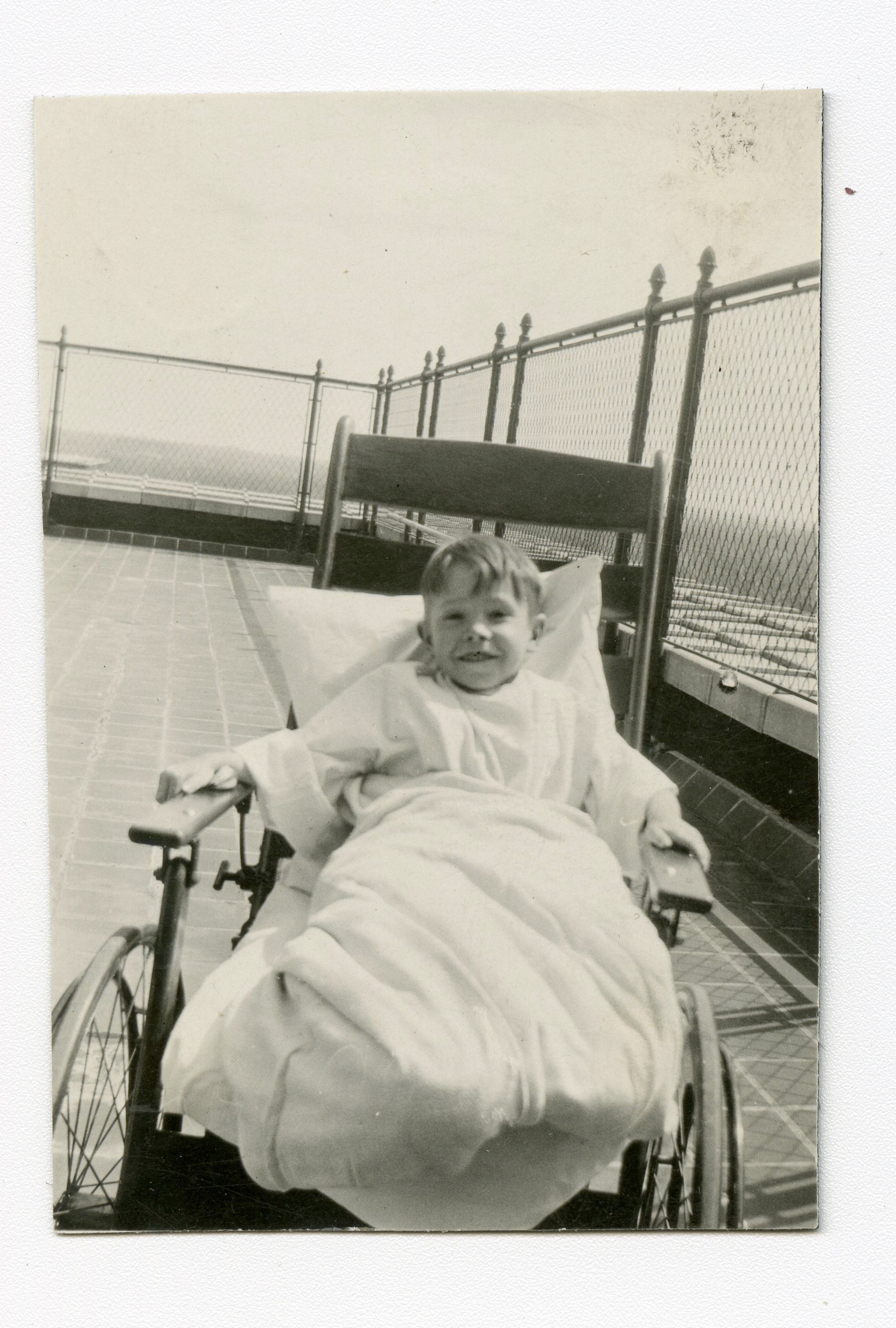 Black and white photograph of Clyde Brunner after a burst appendix. Photograph taken outside.