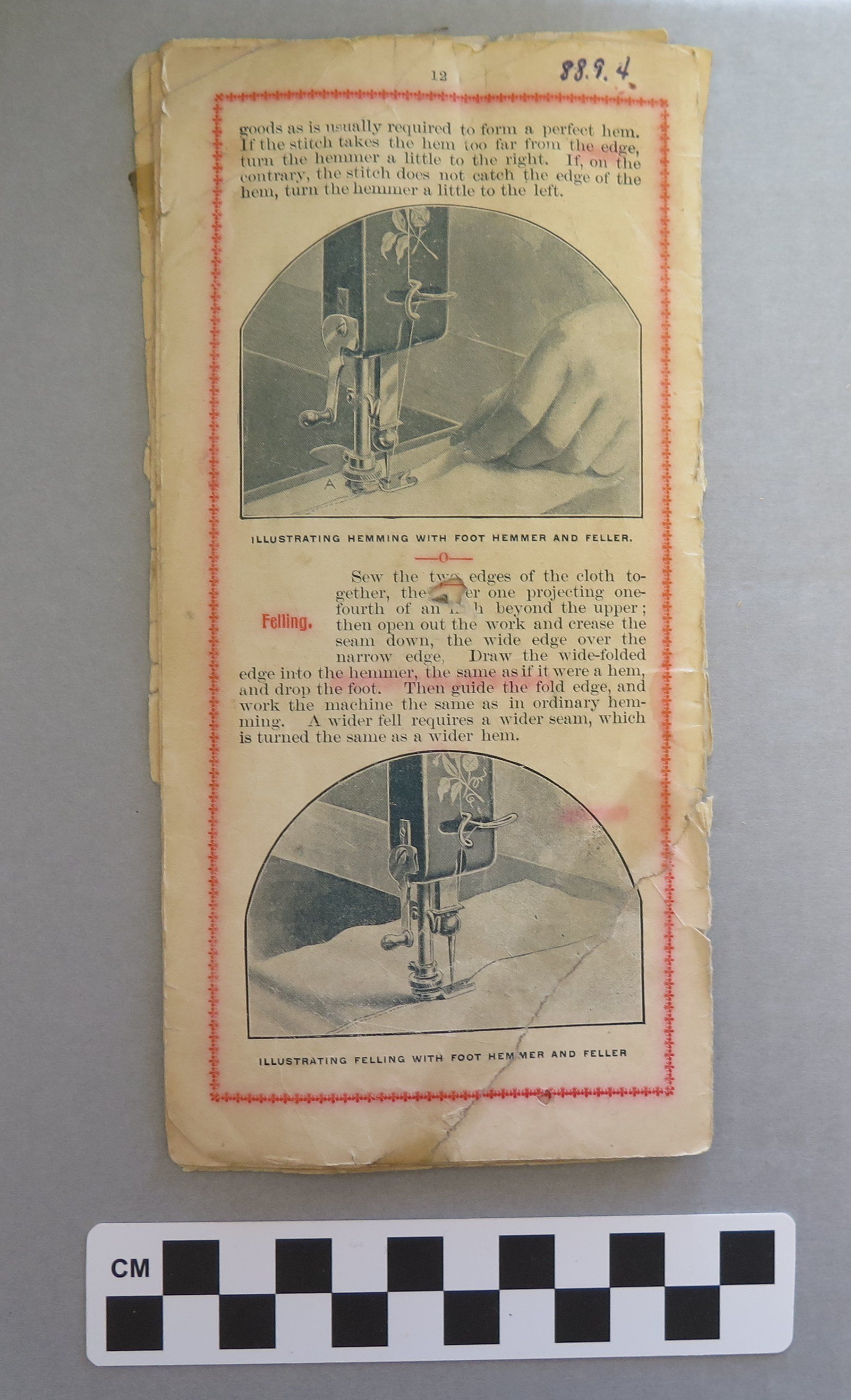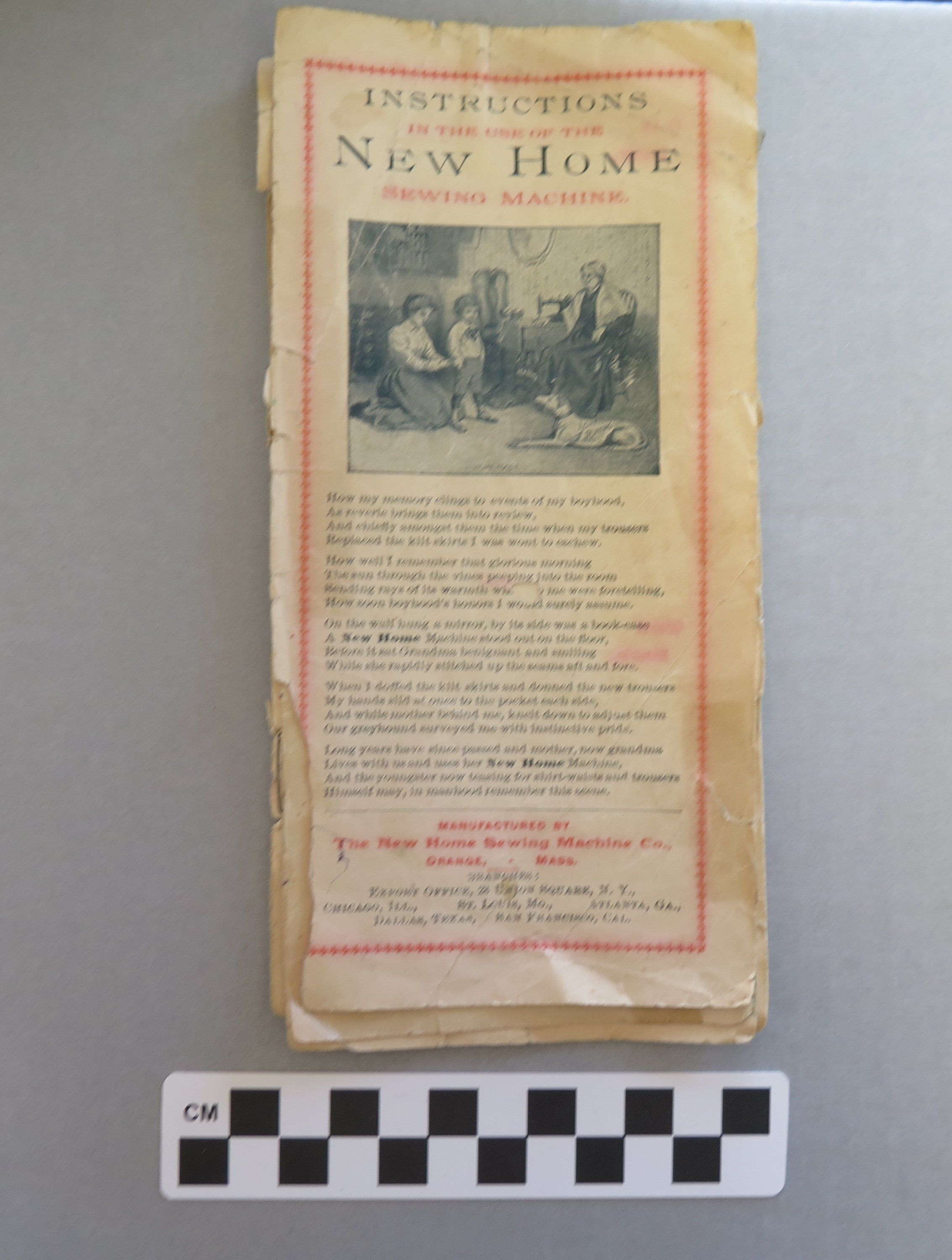 This is a sewing machine instruction booklet for New Home brand sewing machine. The pamphlet is 12 pages long. The pages are brittle and yellowed with ragged edges. The pamphlet measures 4" (w) x 8" (l).