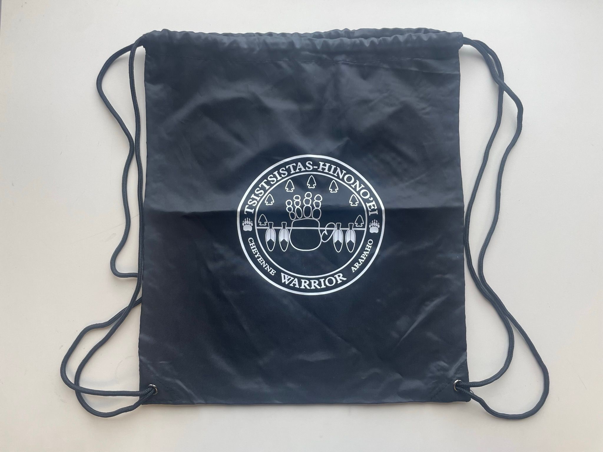 Black polyester drawstring bag printed with the tribal logo/seal for the Tsistsistas-Hinono'ei tribes. Reads "TSISTSISTAS-HINONO'EI / CHEYENNE WARRIOR ARAPAHO" with bear footprints encircling imagery of a hand, arrowheads, and feathers along a horizontal line.Collection