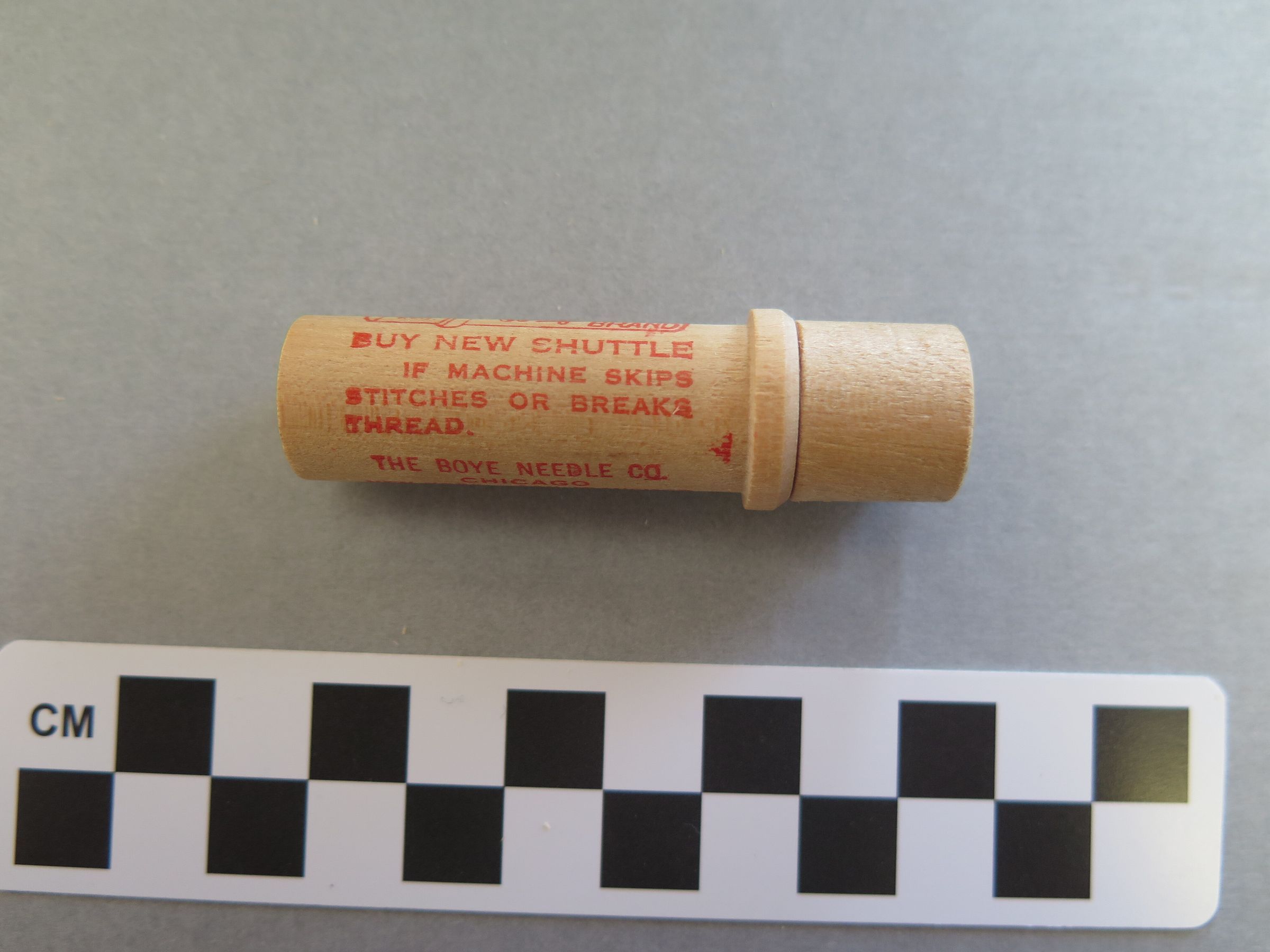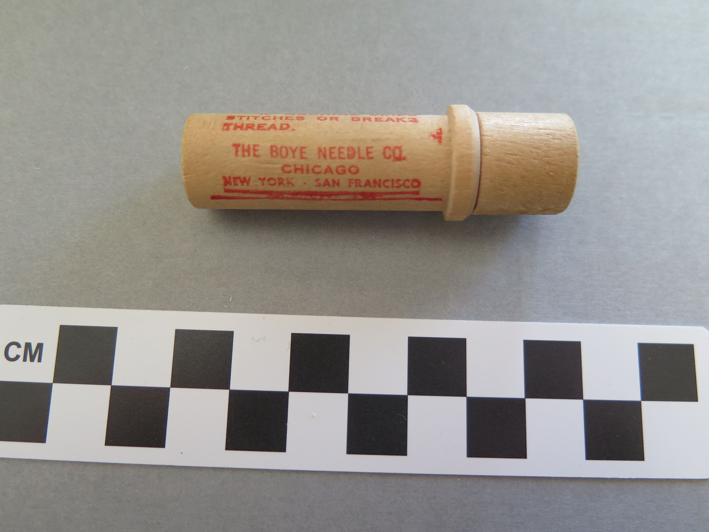 This is a wooden needle case containing 4 metal needles. The case has red text stamped on the outside indicating that the needles are Boye brand. The text reads, "BUY NEW SHUTTLE/ IF MACHINE SKIPS/ STITCHES OR BREAKS/ THREAD./ THE BOYE NEEDLE CO./ CHICAGO/ NEW YORK, SAN FRANCISCO" as well as the Boye brand logo. The text on the top of the lid reads, "6/ 30-80". The case measures 2.5" (h) x 0.75" (diam). The four needles cost 25 cents at the time of purchase.