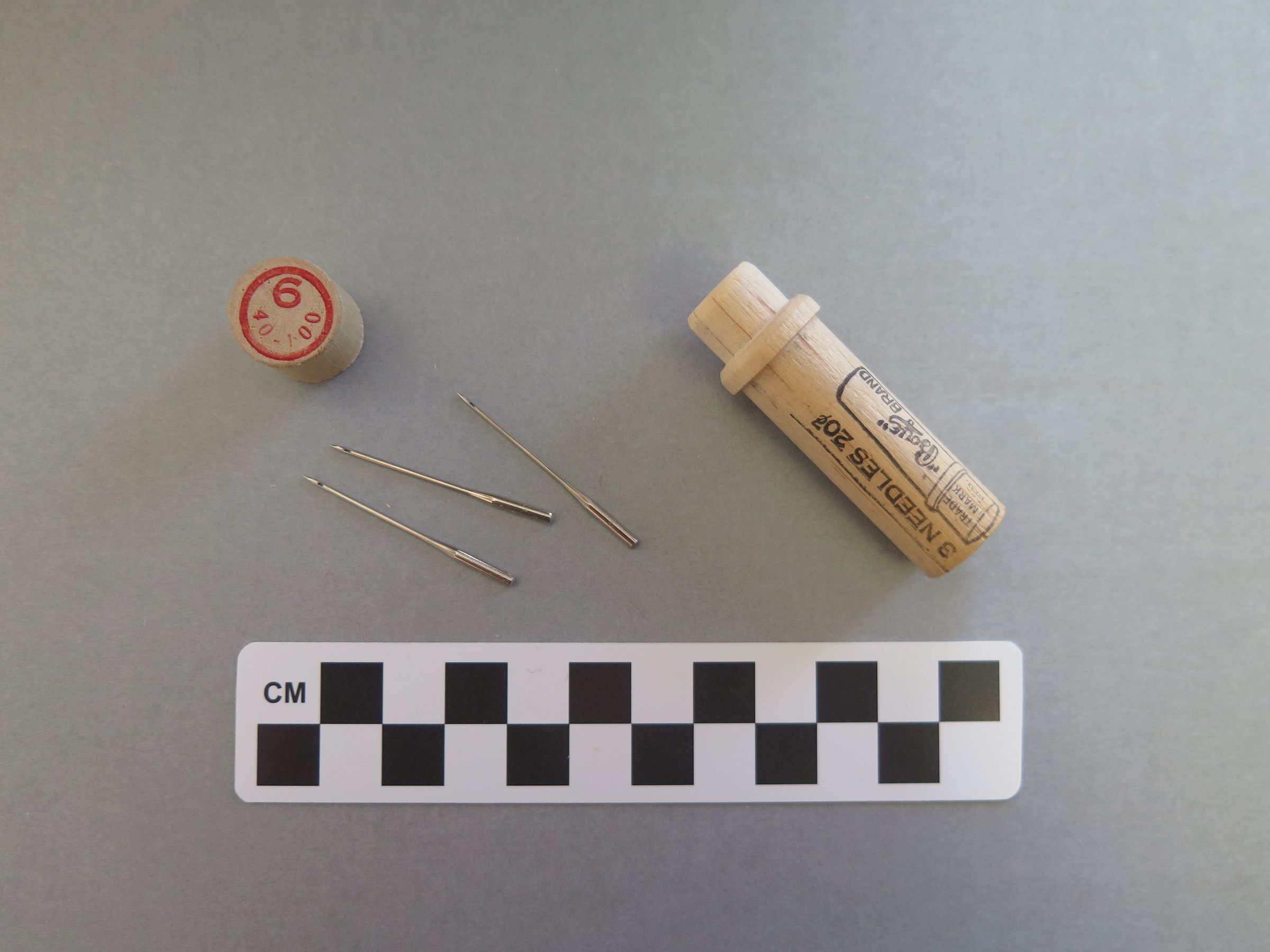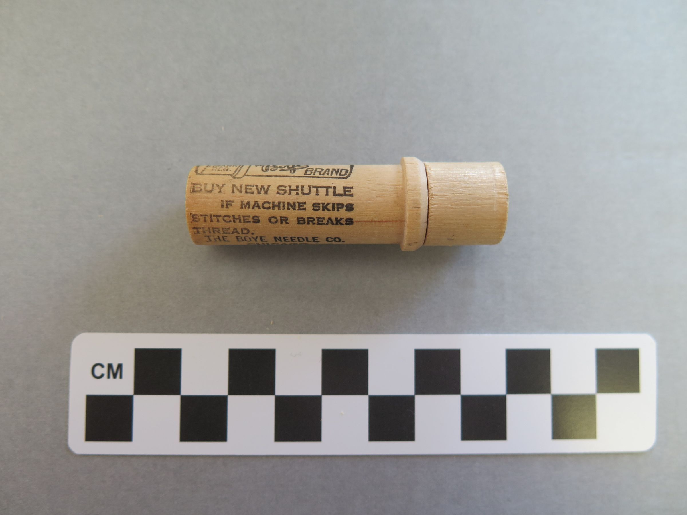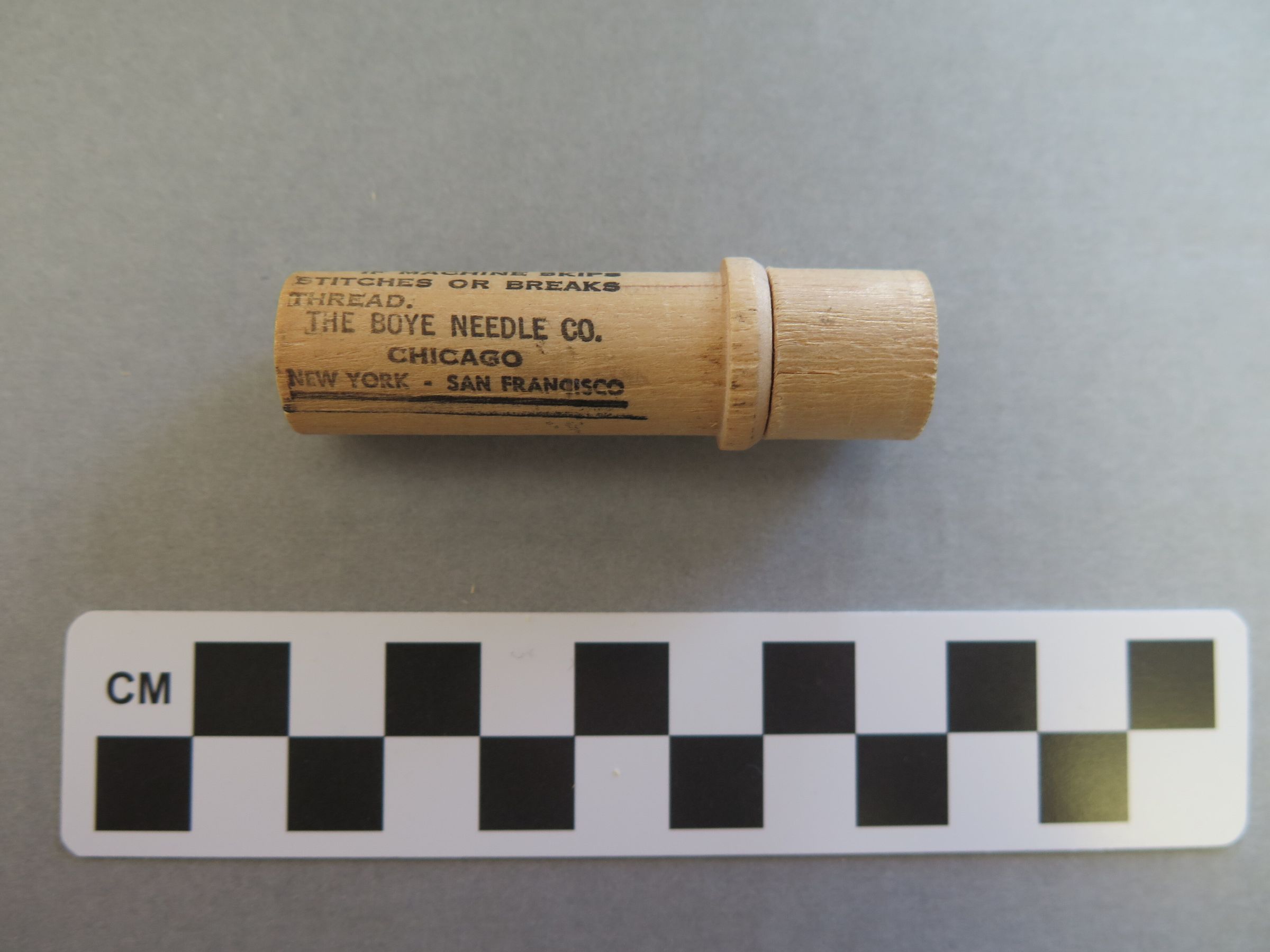 This is a wooden needle case containing 3 metal needles. The case has black text stamped on the outside indicating that the needles are Boye brand. The text reads, "BUY NEW SHUTTLE/ IF MACHINE SKIPS/ STITCHES OR BREAKS/ THREAD./ THE BOYE NEEDLE CO./ CHICAGO/ NEW YORK, SAN FRANCISCO" as well as the Boye brand logo. The text on the top of the lid reads, "6/ 40-100". The case measures 2.5" (h) x 0.75" (diam). The needles cost 20 cents at the time of purchase.