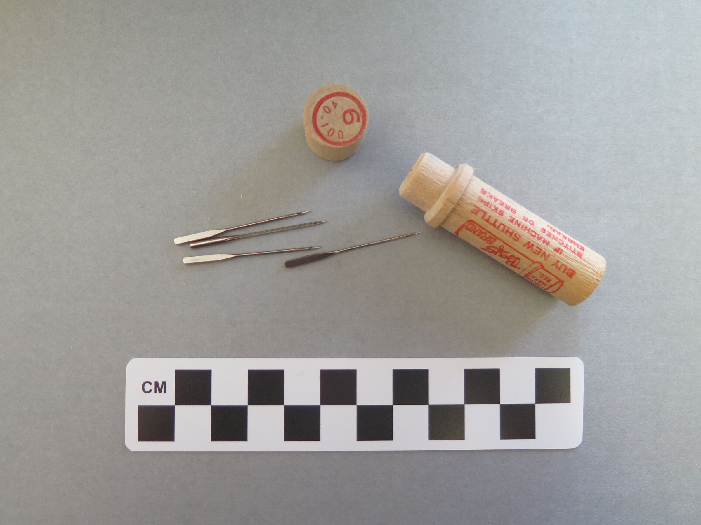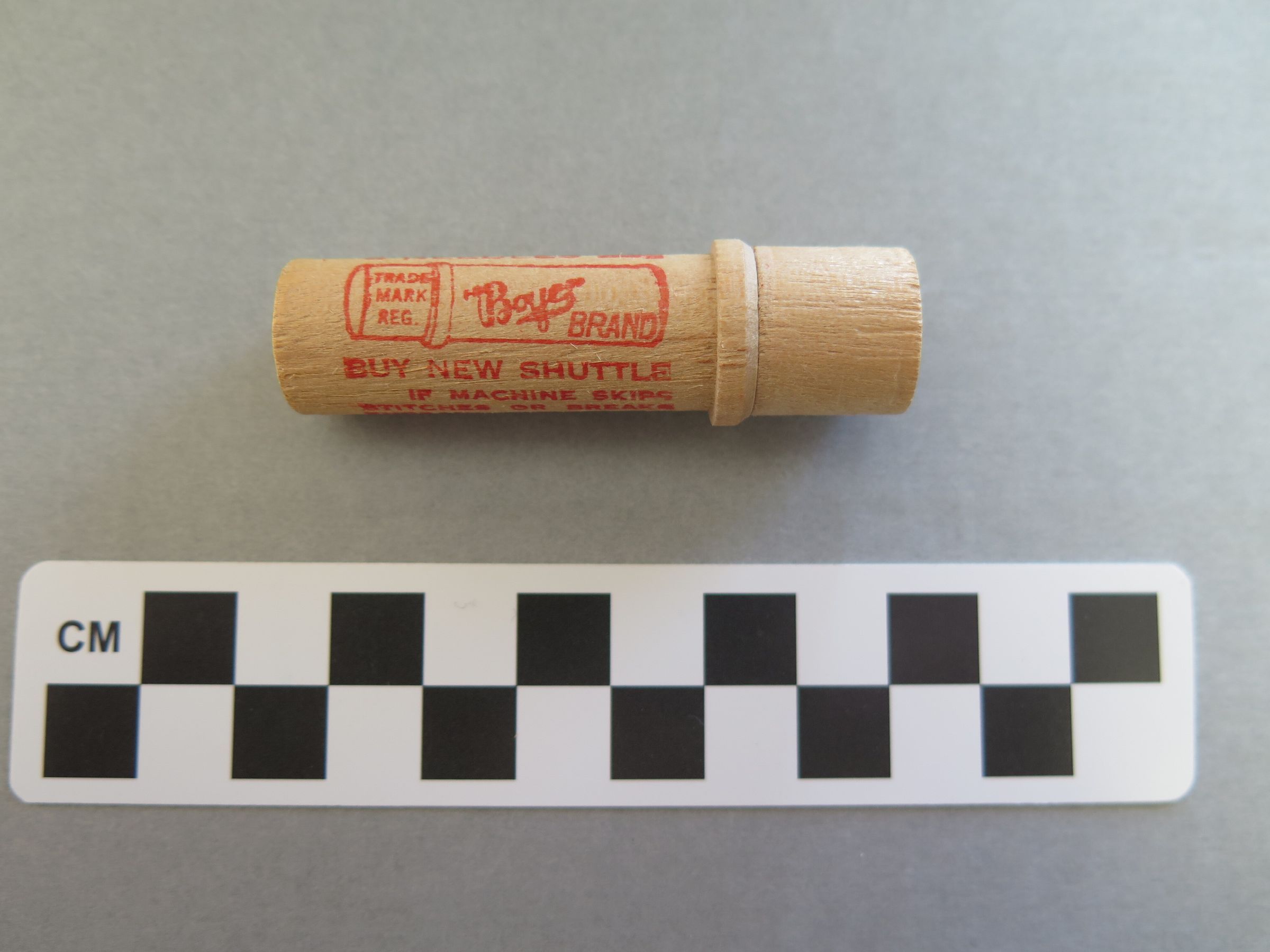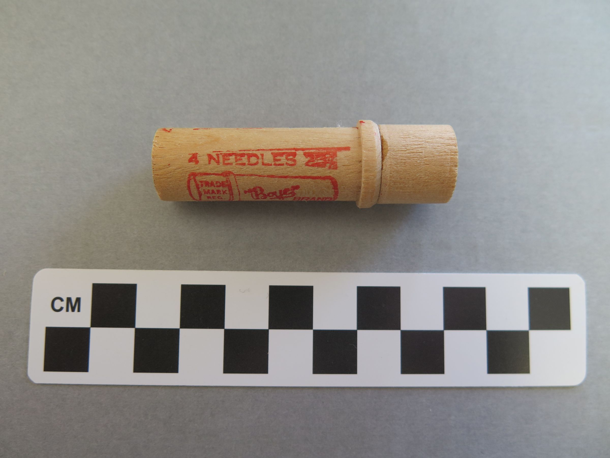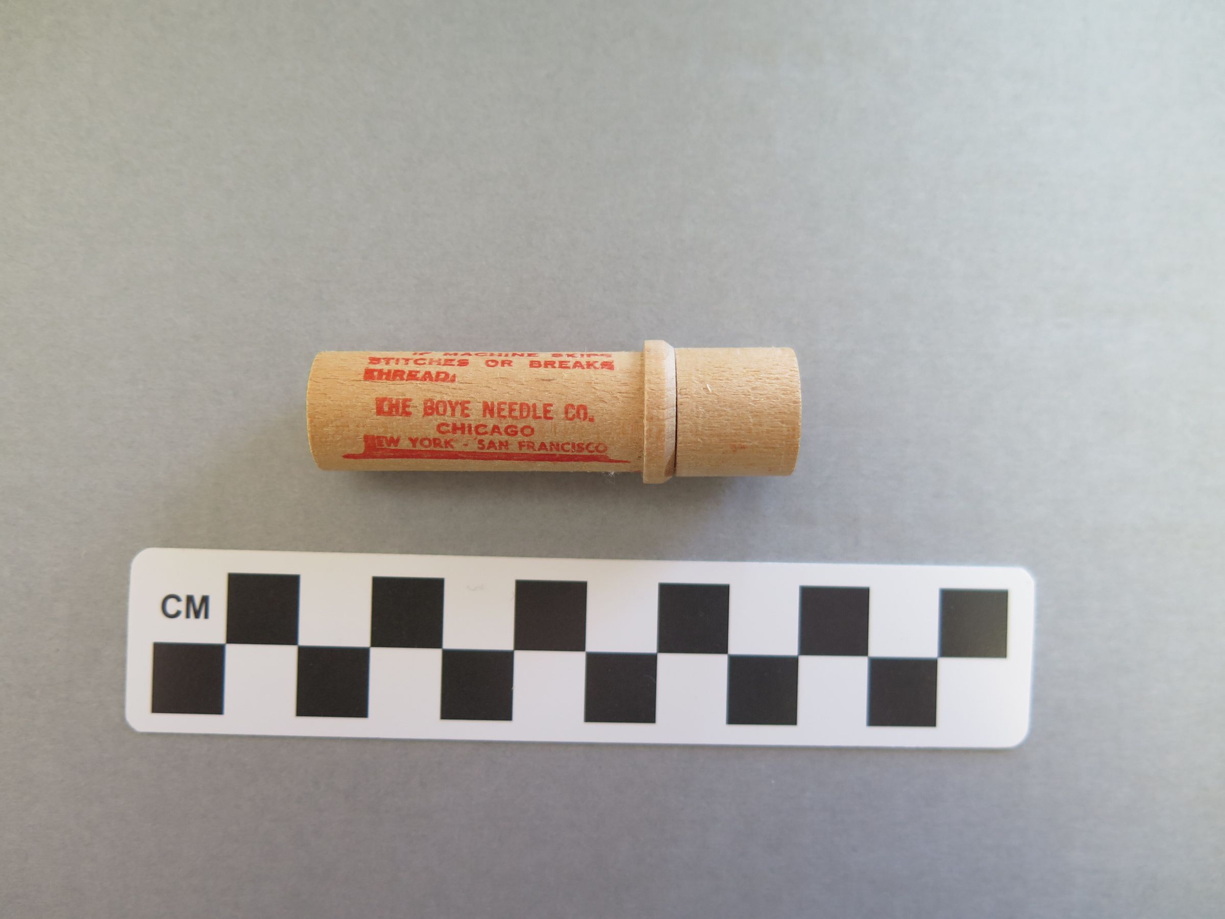 This is a wooden needle case containing 4 metal needles. The case has red text stamped on the outside indicating that the needles are Boye brand. The text reads, "BUY NEW SHUTTLE/ IF MACHINE SKIPS/ STITCHES OR BREAKS/ THREAD./ THE BOYE NEEDLE CO./ CHICAGO/ NEW YORK, SAN FRANCISCO" as well as the Boye brand logo. The text on the top of the lid reads, "6/ 40-100". The case measures 2.5" (h) x 0.75" (diam).