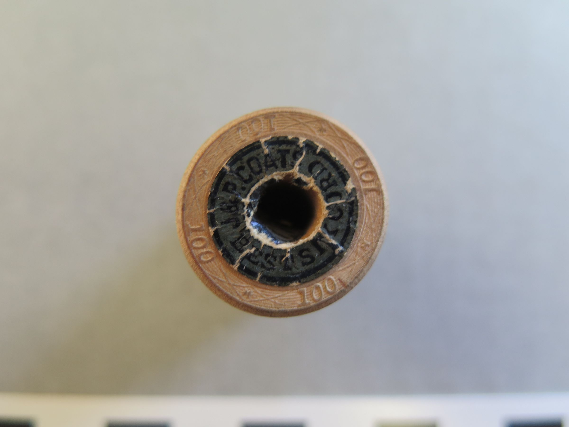 This is a wooden spool of white thread. The number "100" is embossed around the top edge of the spool 4 times. There is a sticker on the top of the spool with text printed on it that reads, "J. & P. COATS/ BEST SILK CORD". The spool measures 1" (h) x 0.75" (diam).
