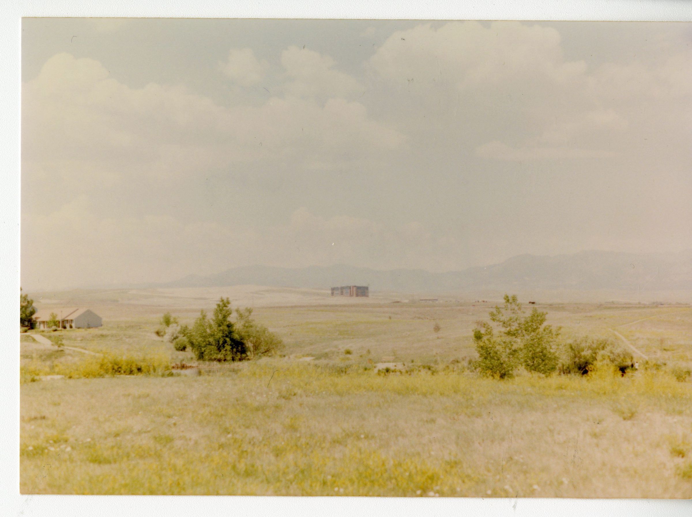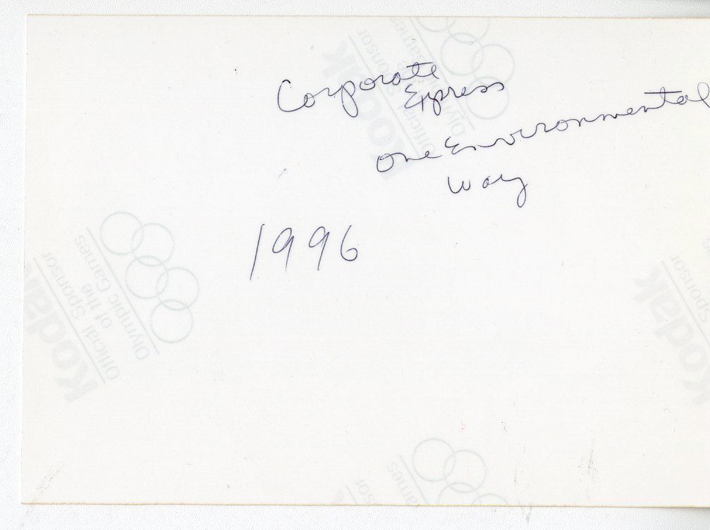 Color photograph showing Corporate Express from a distance. The building in the center of the image is located on One Environmental Way. Photograph probably taken in Lac Amora. There is an additional building on the far left of the image, probably a house. Image is looking south west. Photograph was taken in 1996.