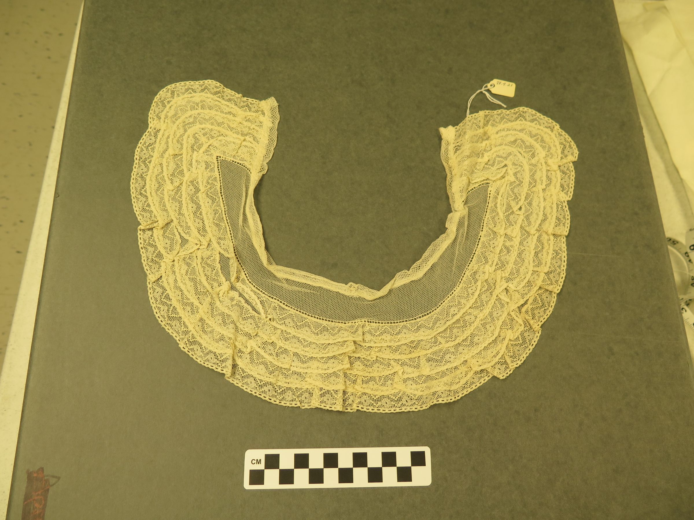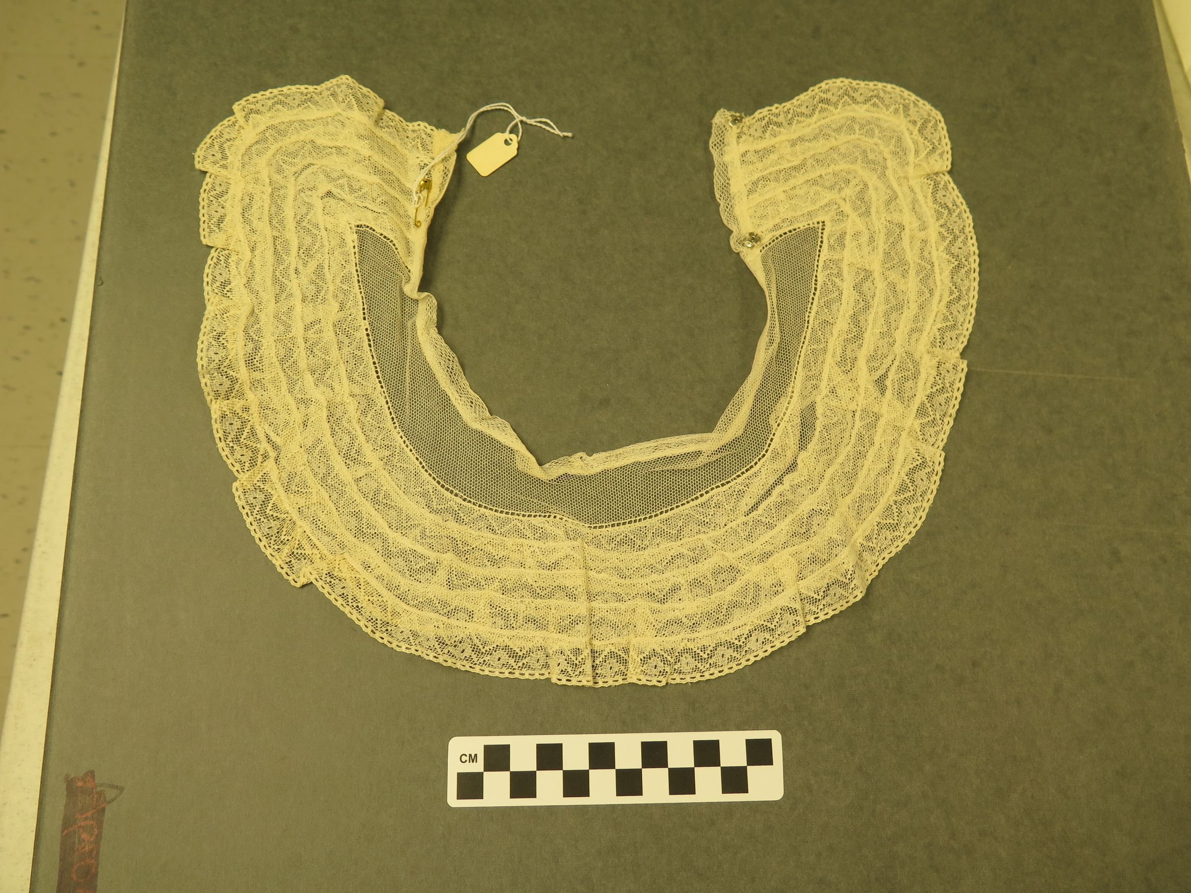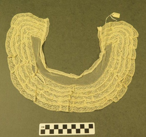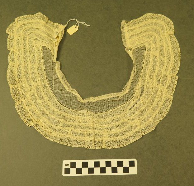 This is an off-white lace collar. On one side of the collar is 2 female sides of snap buttons. The collar is made of a semi-circular piece of lace. The collar measures 4.5" (w) x 17.5" (l).